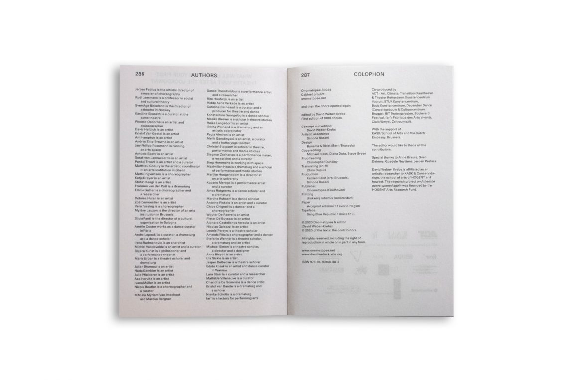 - Paula Almiron, Kristof van Baarle, Sven Age Birkeland, Antonia Baehr, Caroline Barneaud, Nicole Beutler, Maaike Bleeker, Julien Bruneau, Pieter De Buysser, Alondra Castellanos, Chloé Chignell, Amélie Coster, Jasper Delbecke, Zoë Demoustier, Wouter De Raeve, Charlotte De Somviele, Katja Dreyer, Jeroen Fabius, Silvia Fanti, Far, Nicolas Galeazzi, Emilie Gallier, Nada Gambier, Melih Gencboyaci, Konstantina Georgelou, Kristof van Gestel, Matthieu Goeury, Maximilian Haas, Ant Hampton, David Helbich, Marijke Hoogenboom, Rita Hofwijk, Breg Horemans, Asa Horvitz, Dolores Hulan, Mette Ingvartsen, Myriam Van Imschoot and Marcus Bergner (MM), Stefan Kaegi, Edyta Kozak, Bojana Kunst, Rudi Laermans, Sarah van Lamsweerde, Heike Langsdorf, Mylène Lauzon, André Lepecki, Kopano Maroga, Ivana Müller, Phoebe Osborne, Leonie Persyn, Julie Pfleiderer, Antoine Pickels, Amanda Piña, Jan-Philipp Possmann, Fransien van der Putt, Irena Radmanovic, Anna Rispoli, Martina Ruhsam, Jonas Rutgeerts, Nienke Scholts, Ula Sickle, Michael Simon, Karoline Skuseth, Lara Staal, Christel Stalpaert, Danae Theodoridou, Pankaj Tiwari, Vera Tussing, Marie Urban, Michiel Vandevelde, Hidde Aans Verkade, Mathilde Villeneuve, Georg Weinand, Stefanie Wenner, Siegmar Zacharias, Andros Zins-Browne