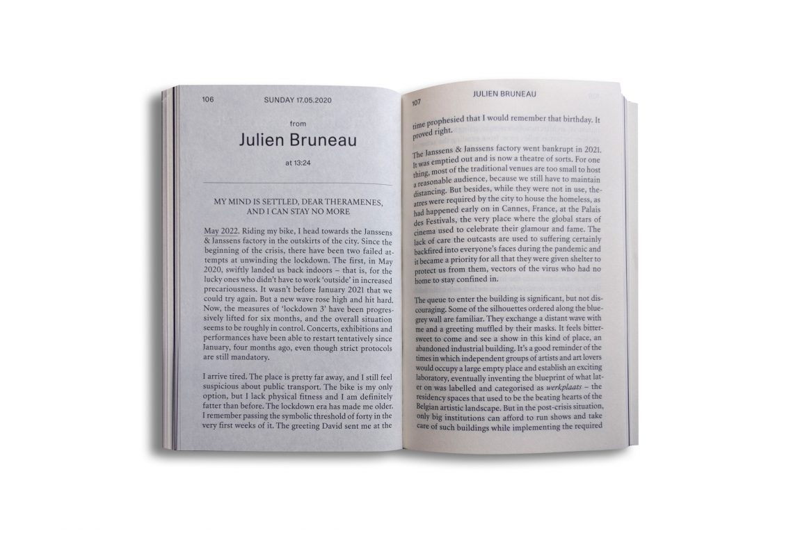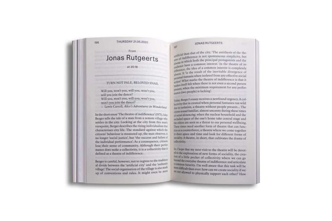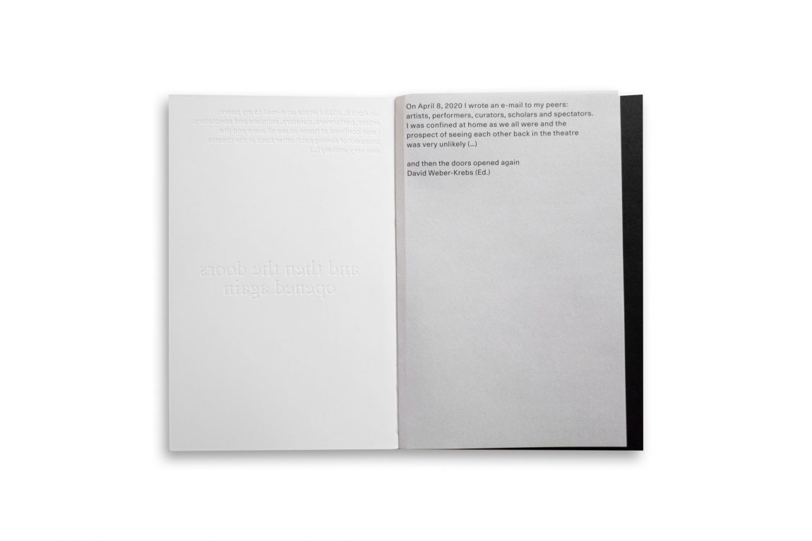 Locked down at home during the first wave of Covid-19, David Weber-Krebs kept on thinking about the day when theatres would open their doors again. At that point, it was somehow difficult to even picture that moment. On the 8th of April, 2020, in the middle of the lockdown, David sent an e-mail to his peers: artists, scholars, curators, and spectators belonging to different art communities. In this e-mail, there was a simple question: What will happen on your first theatre visit after the lockdown? It was an invitation to imagine the future of theatre from this very specific moment when theatres were all closed and when it was not clear how and when and if they would open again.