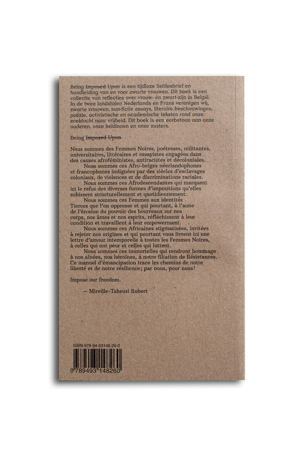 Being is een tijdloze liefdesbrief en handleiding van en voor zwarte vrouwen. Dit boek is een collectie van reflecties over vrouw- én zwart-zijn in België. In de twee landstalen Nederlands en Frans verenigen wij, zwarte vrouwen, non-fictie essays, literaire beschouwingen, poëzie, activistische en academische teksten rond onze zoektocht naar vrijheid. Dit boek is een eerbetoon aan onze ouderen, onze heldinnen en onze zusters.