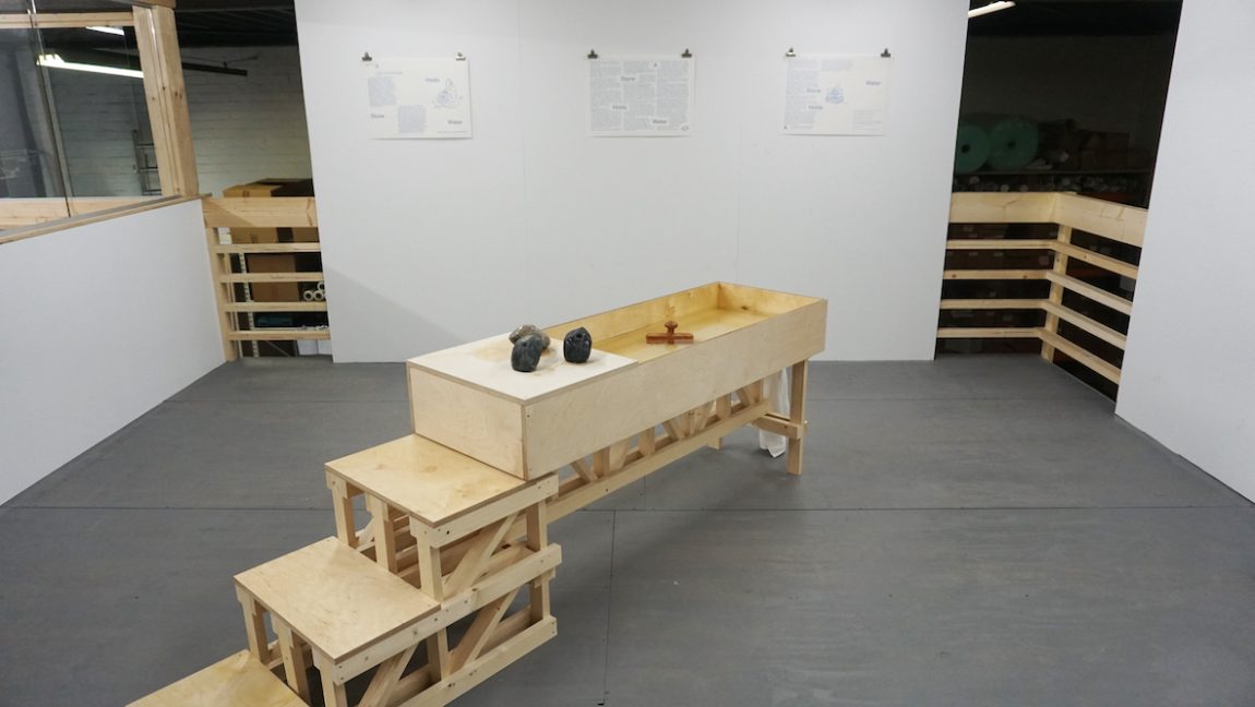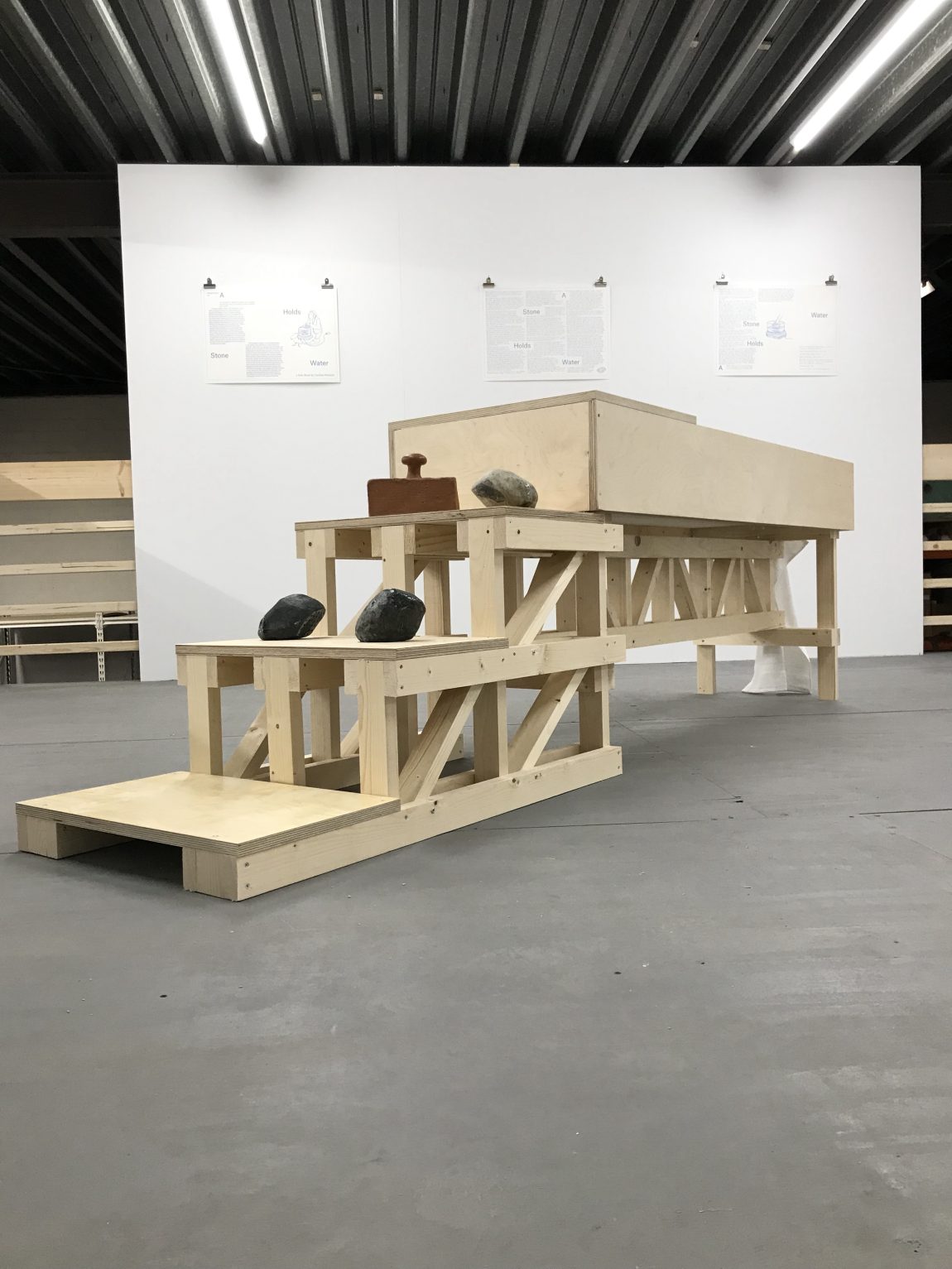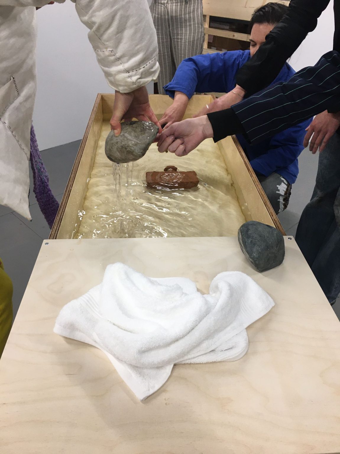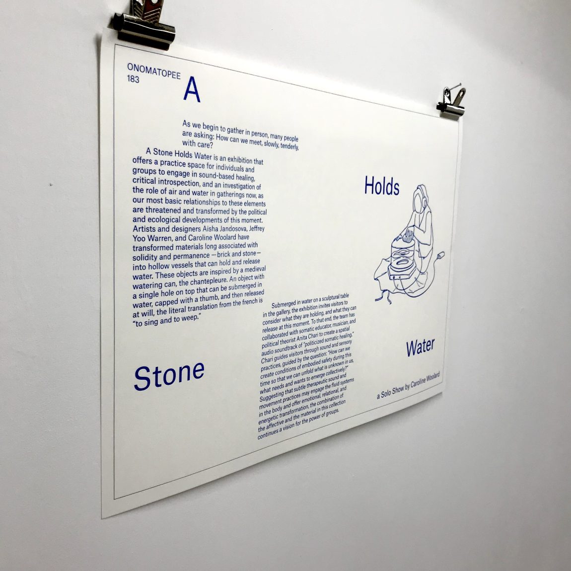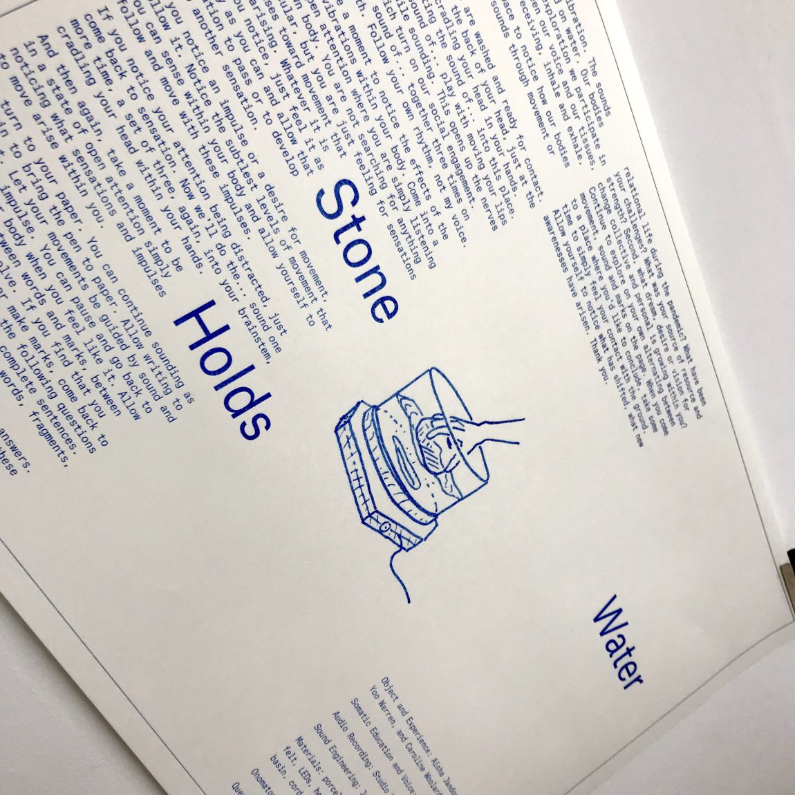 A Stone Holds Water is an exhibition at Onomatopee that offers a practice space for individuals and groups to engage in sound-based healing, critical introspection, and an investigation of the role of air and water in gatherings now, as our most basic relationships to these elements are threatened and transformed by the political and ecological developments of this moment. Artists and designers Aisha Jandosova, Jeffrey Yoo Warren, and Caroline Woolard have transformed materials long associated with solidity and permanence -- brick and stone -- into hollow vessels that can hold and release water. These objects are inspired by a medieval watering can, the chantepleure. An object with a single hole on top that can be submerged in water, capped with a thumb, and then released at will, the literal translation from the french is “to sing and to weep.”