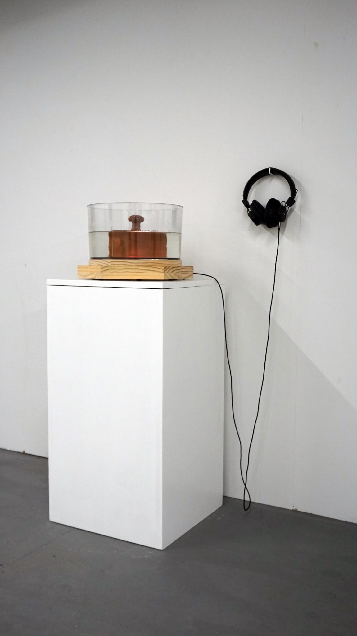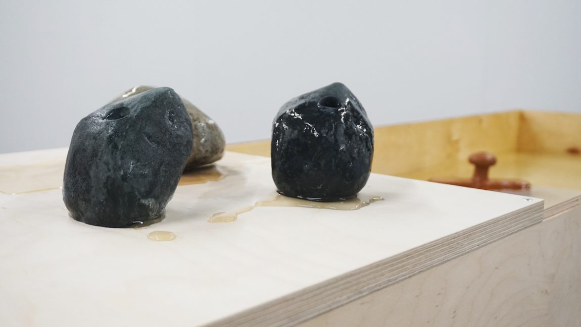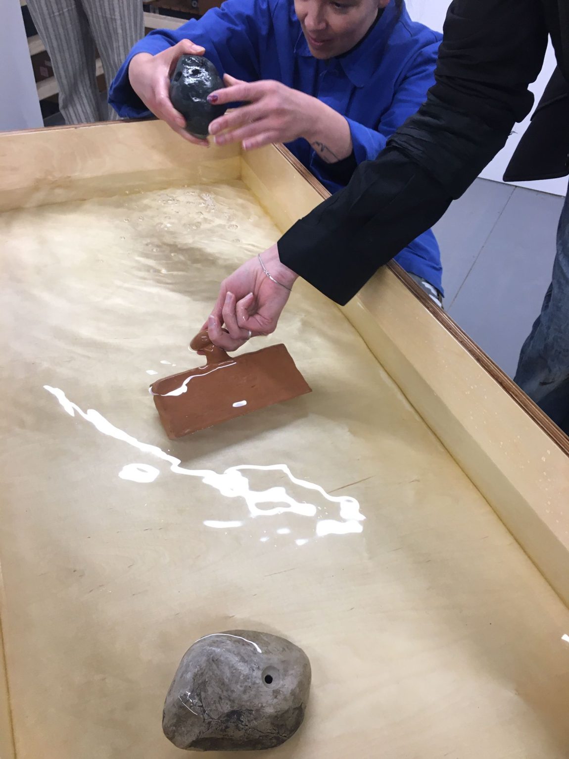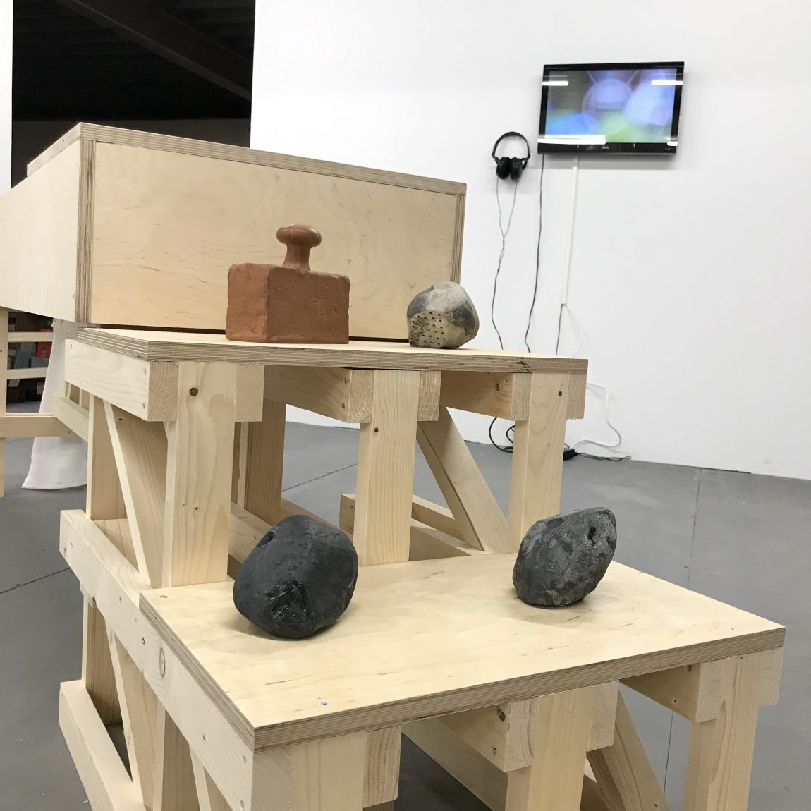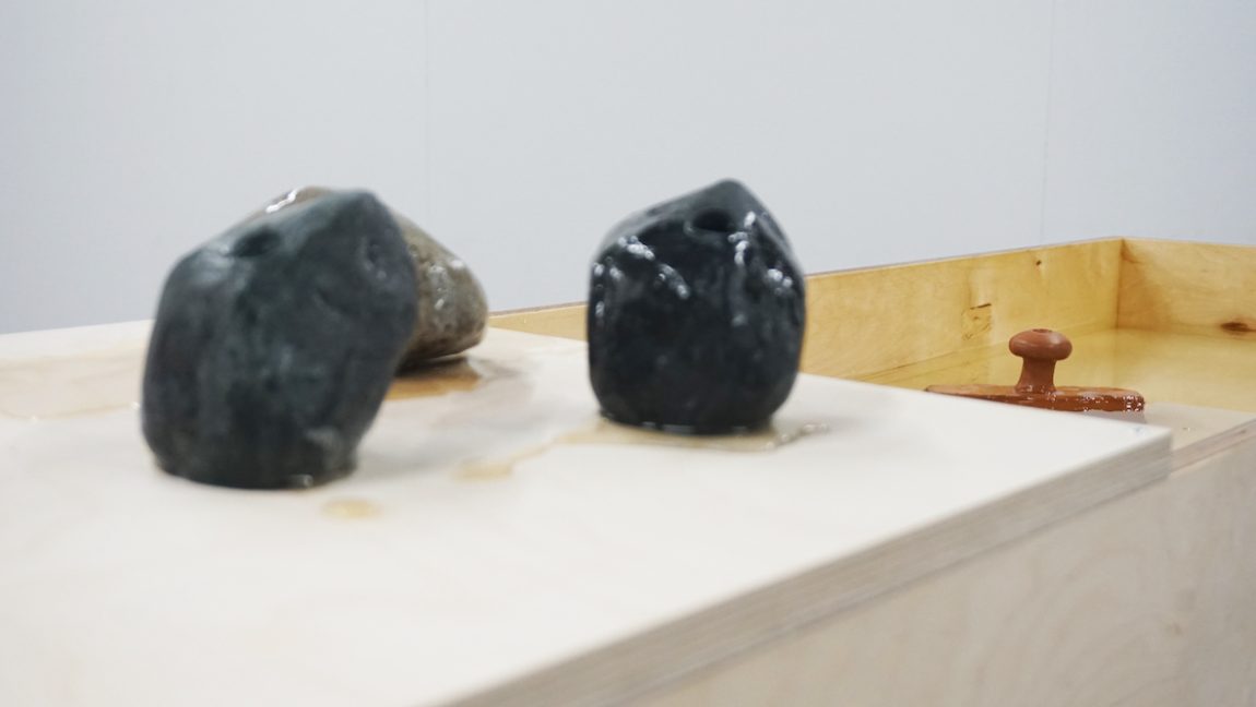 A Stone Holds Water is an exhibition at Onomatopee that offers a practice space for individuals and groups to engage in sound-based healing, critical introspection, and an investigation of the role of air and water in gatherings now, as our most basic relationships to these elements are threatened and transformed by the political and ecological developments of this moment. Artists and designers Aisha Jandosova, Jeffrey Yoo Warren, and Caroline Woolard have transformed materials long associated with solidity and permanence -- brick and stone -- into hollow vessels that can hold and release water. These objects are inspired by a medieval watering can, the chantepleure. An object with a single hole on top that can be submerged in water, capped with a thumb, and then released at will, the literal translation from the french is “to sing and to weep.”
