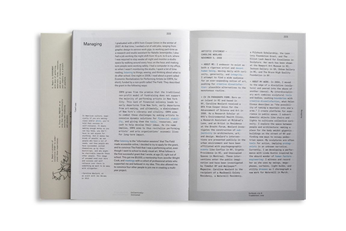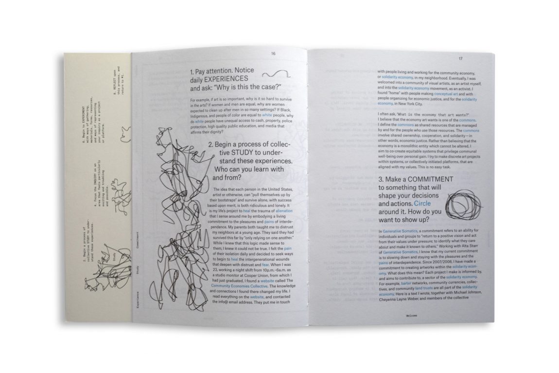 Caroline Woolard (b.1984) is an American artist who, in making her art, becomes an economic critic, social justice facilitator, media maker, and sculptor. Since the financial crisis of 2007-8, Woolard has catalyzed barter communities, minted local currencies, founded an arts-policy think tank, and created sculptural interventions in office spaces. Woolard has inspired a generation of artists who wish to create self-organized, collaborative, online platforms alongside sculptural objects and installations. Her work has been commissioned by and exhibited in major national and international museums including MoMA, the Whitney Museum, and Creative Time. Woolard’s work has been featured twice on New York Close Up (2014, 2016), a digital film series produced by Art21 and broadcast on PBS. She is the 2018–20 inaugural Walentas Fellow at Moore College of Art and Design, the inaugural 2019–20 Artist in Residence for INDEX at the Rose Museum, and a 2020-2021 Fellow at the Center for Cultural Innovation.