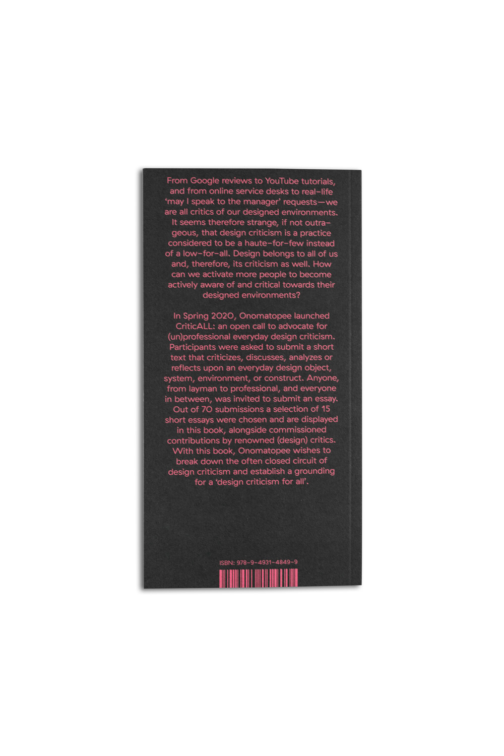 Onomatopee launched an open call to advocate for (un)professional everyday design criticism. Participants were asked to submit a short text that criticizes, discusses, analyzes or reflects upon an everyday design object, system, environment, or construct. The 15 selected essays can be read individually in the installation and will soon be published collectively in a book.