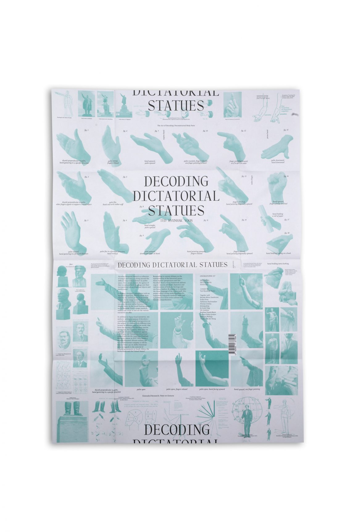 Sparked by a database of images that when organised become a tool for decoding, the publication Decoding Dictatorial Statues by Korean graphic design researcher Ted Hyunhak Yoon, offers a real time analysis, an empirical understanding and data for reflection on gestural politics. While the work forefronts the actual status of statues, the various texts, collected by writer Bernke Klein Zandvoort, revolve around the different ways we can look at statues in public space. How can we decode statues and their visual languages, their object hood and materiality, their role as media icons and their voice in political debates?