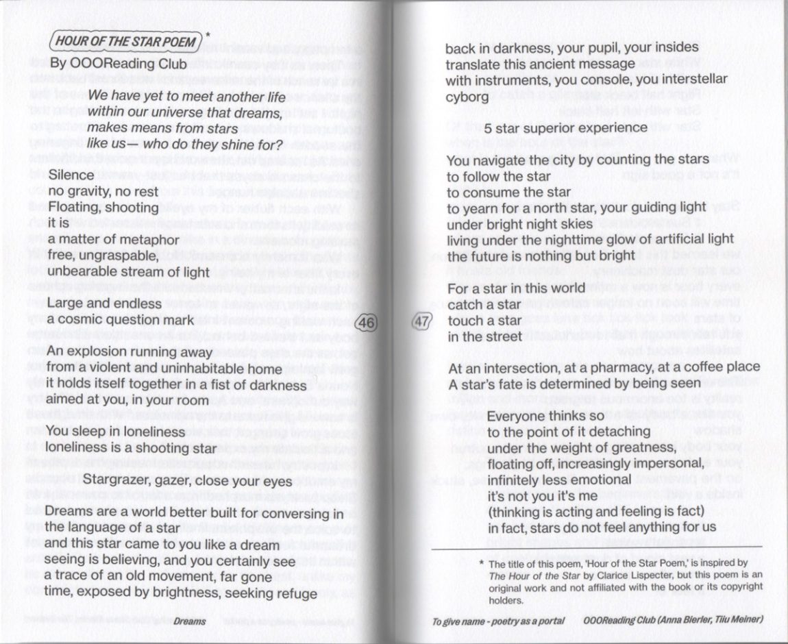 Including a performance/collective reading by OOOReading Club, titled 'Hour of the star'. They will present an interactive poem about the chasmic/cosmic boundaries between our waking and dreamworlds.
