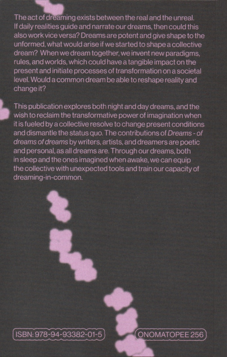 'Dreams of dreams of dreams' is an exhibition and public program which explores the transformative power of imagination when fuelled by a collective resolve to dismantle the status quo. Continuously re-imaging alternative presents, the collective body creates new tools and paradigms. Through artistic exploration, the exhibited works and activities delve into the experience of precarity as a shared condition for common survival. Dreaming thus becomes a communal practice—a process to be contextualized, cultivated, safeguarded, and nurtured. Within this space, we are offered the opportunity to rehearse new worlds together and to train our capacity of dreaming-in-common.