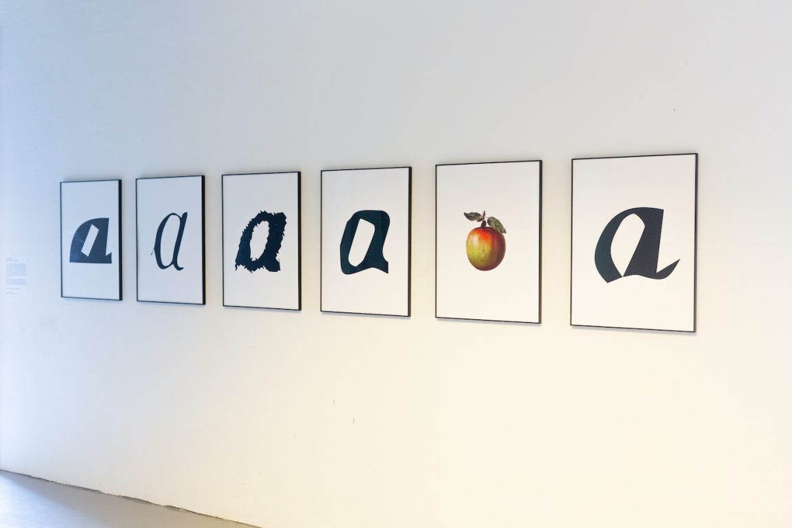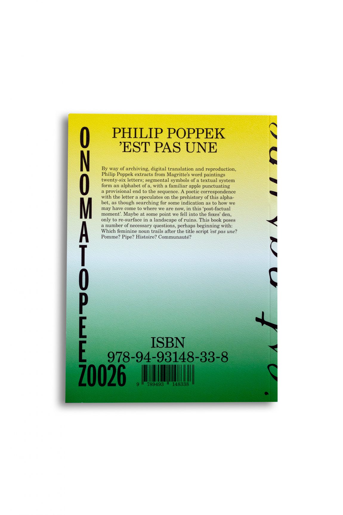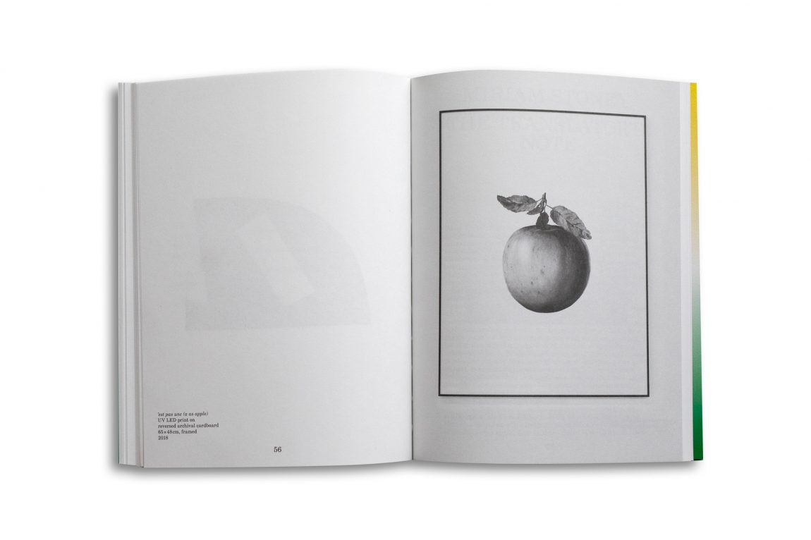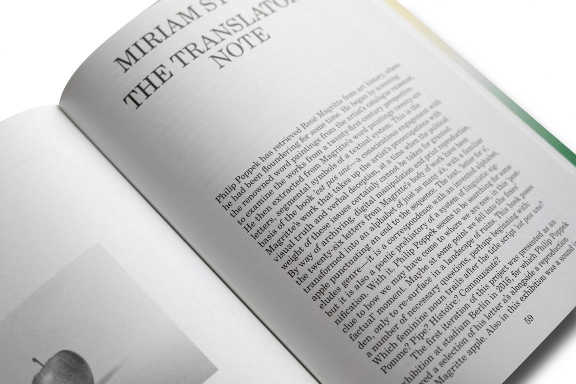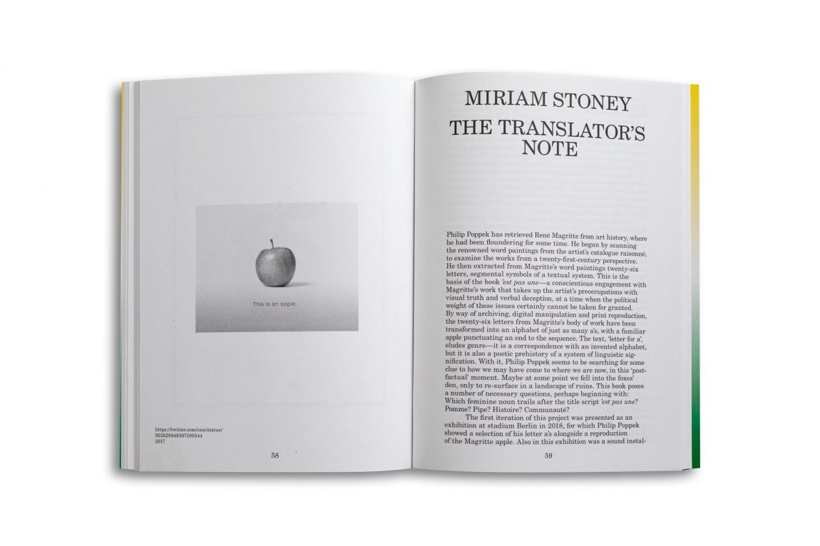 By way of archiving, digital translation and reproduction, Philip Poppek extracts from Magritte’s word paintings twenty-six letters; segmental symbols of a textual system form an alphabet of a, with a familiar apple punctuating a provisional end to the sequence. A poetic correspondence with the letter a speculates on the prehistory of this alphabet, as though searching for some indication as to how we may have come to where we are now, in this ‘post-factual moment’.