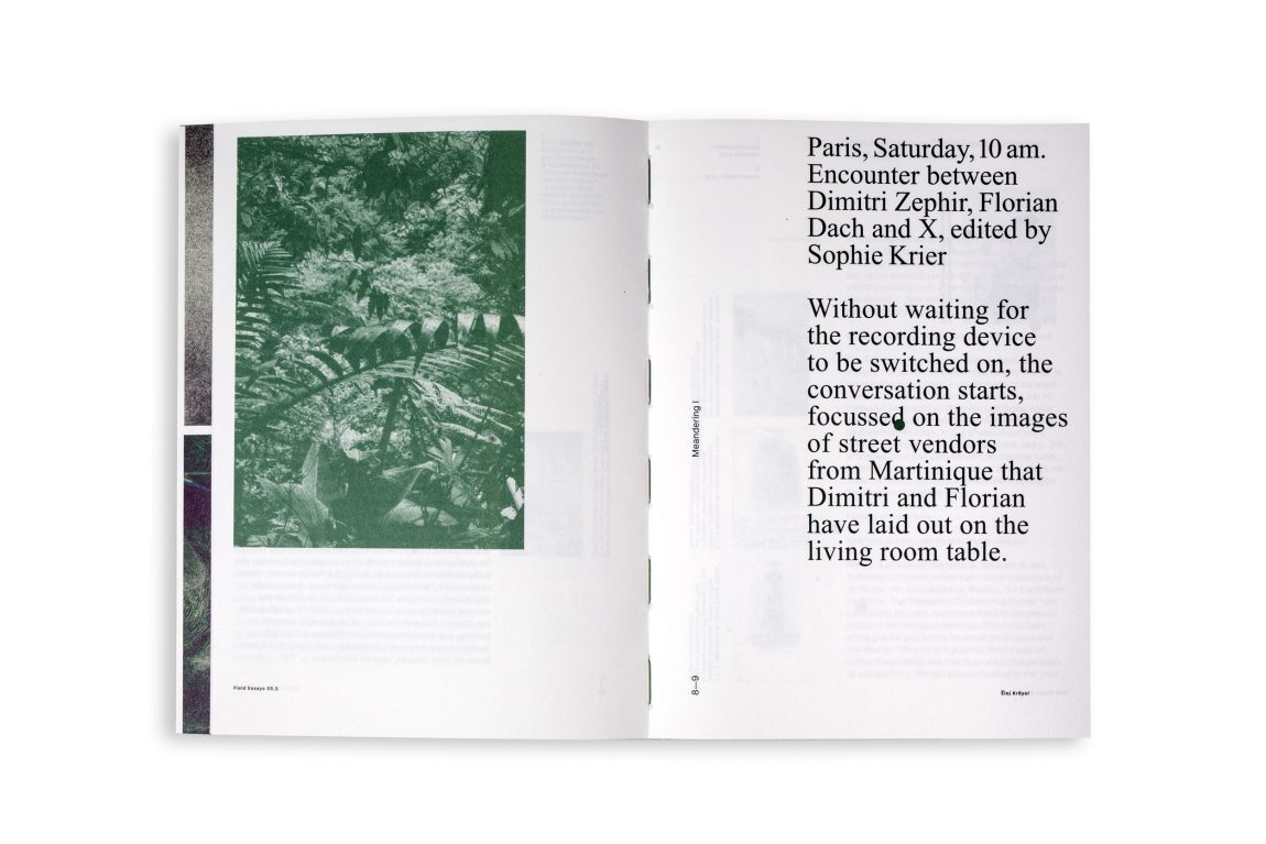 Sophie Krier founded Field Essays (2008 – ongoing) in order to investigate which forms of knowing are embedded in artistic processes, and how can these be shared and published. Field Essays explores peripheral practices that probe unknown territories and methods and works from specificity, momentum and dialogue; the editorial research functions as a conversation platform that experiments with ways to articulate the motives and sources of invited practitioners. The ensuing conversation can take the form of books, debates, workshops, short residencies, interviews or exhibitions. In essence, Field Essays is both fieldwork and reflection: for each issue Krier orchestrates an encounter between a chosen practitioner and someone with another perspective in an effort to start a shared reflection on the alternative forms of knowledge that the artifacts and gestures in the work at hand engender.