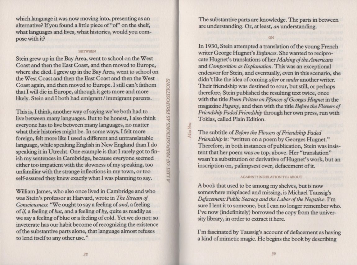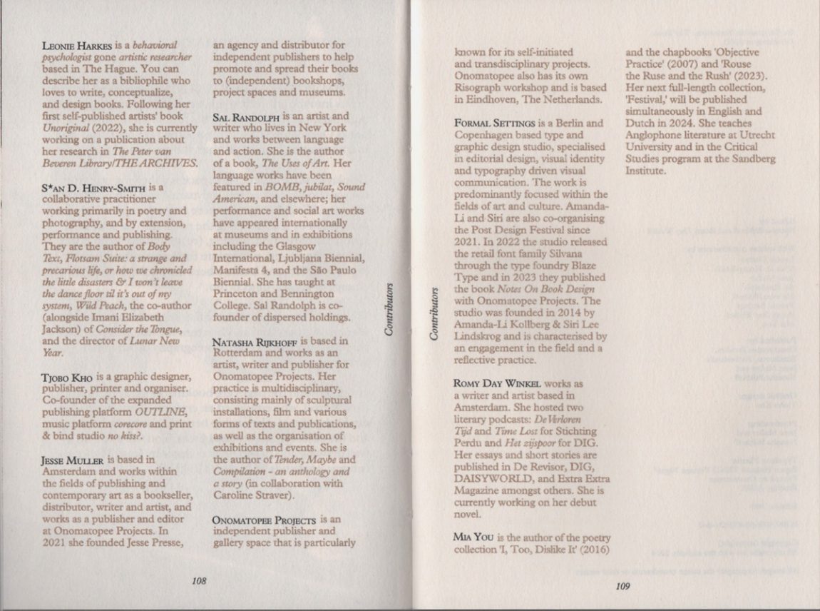 There are compact essays on the design, form and feeling of three of Onomatopee’s publications by Formal Settings, the authors of Notes on Book Design (2023), as well as Ambient Reading, A Method by Sal Randolph. Mia You has contributed A List of Prepositions as Propositions, to which Romy Day Winkel has responded by applying an erasure poetry writing method to fifty silk bookmarks.