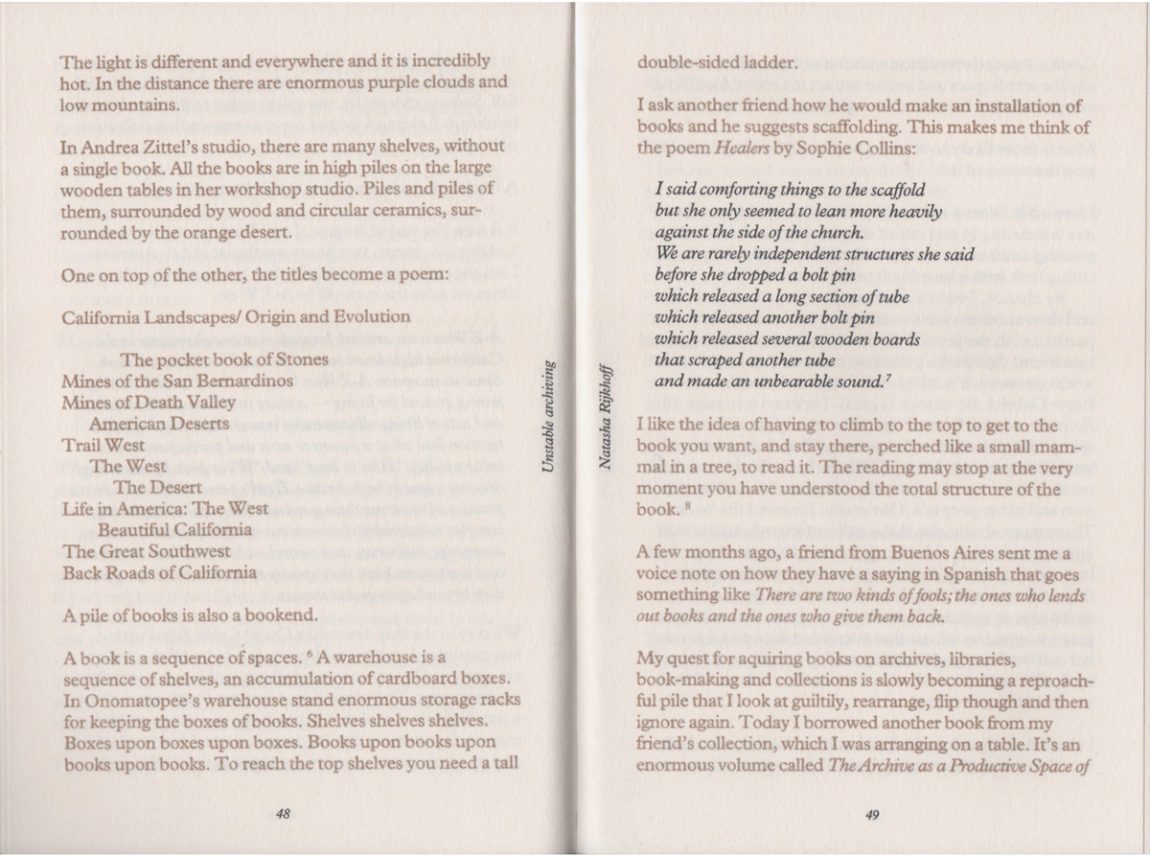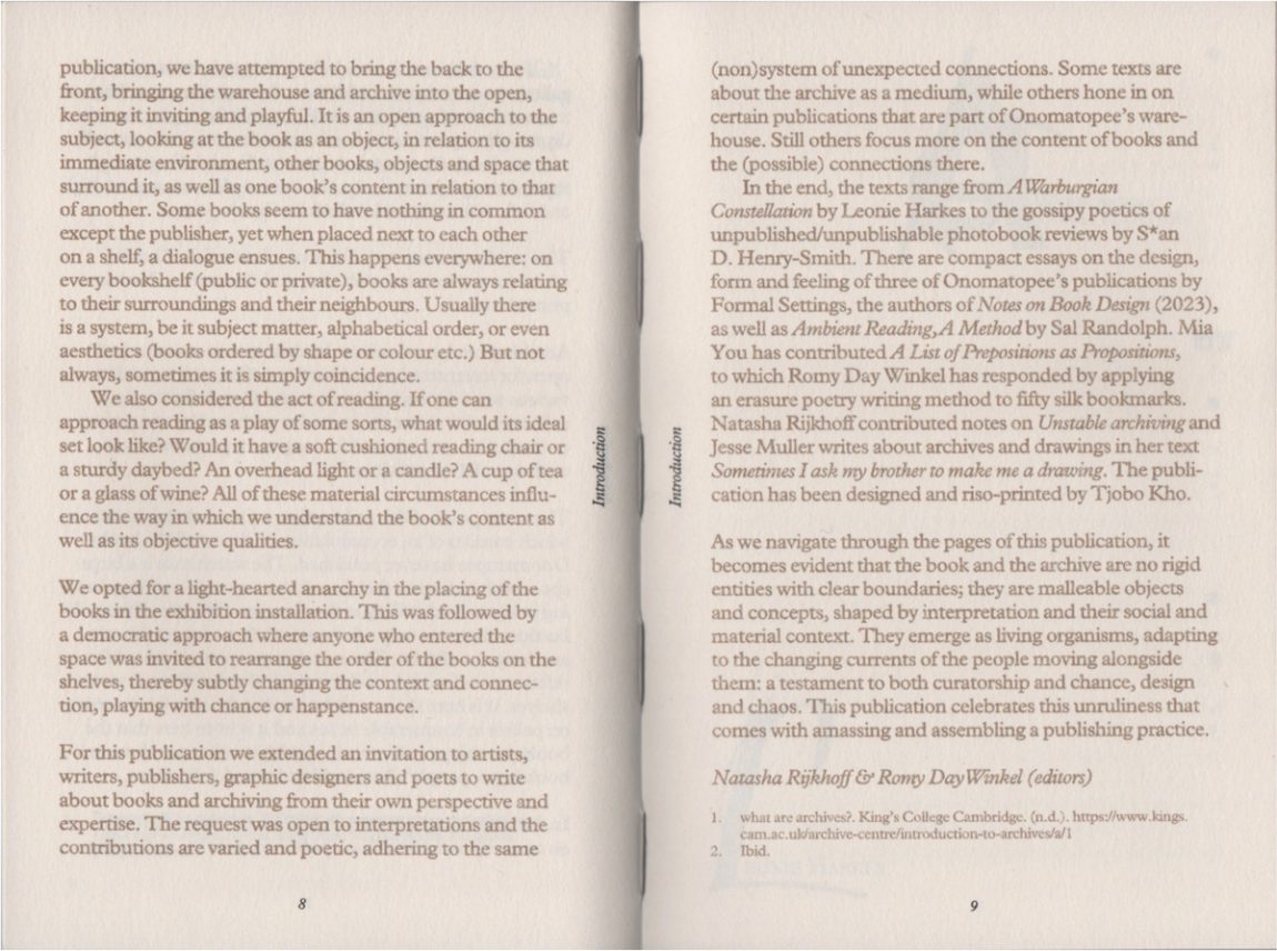 As we navigate through the pages of this publication, it becomes evident that the book and the archive are no rigid entities with clear boundaries; they are malleable objects and concepts, shaped by interpretation and their social and material context. They emerge as living organisms, adapting to the changing currents of the people moving alongside them: a testament to both curatorship and chance, design and chaos. This publication celebrates this unruliness that comes with amassing and assembling a publishing practice.