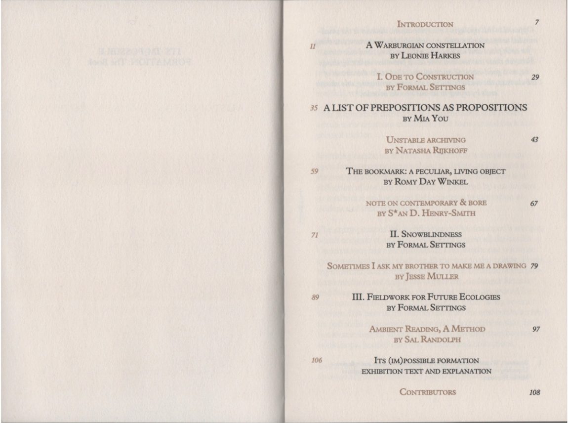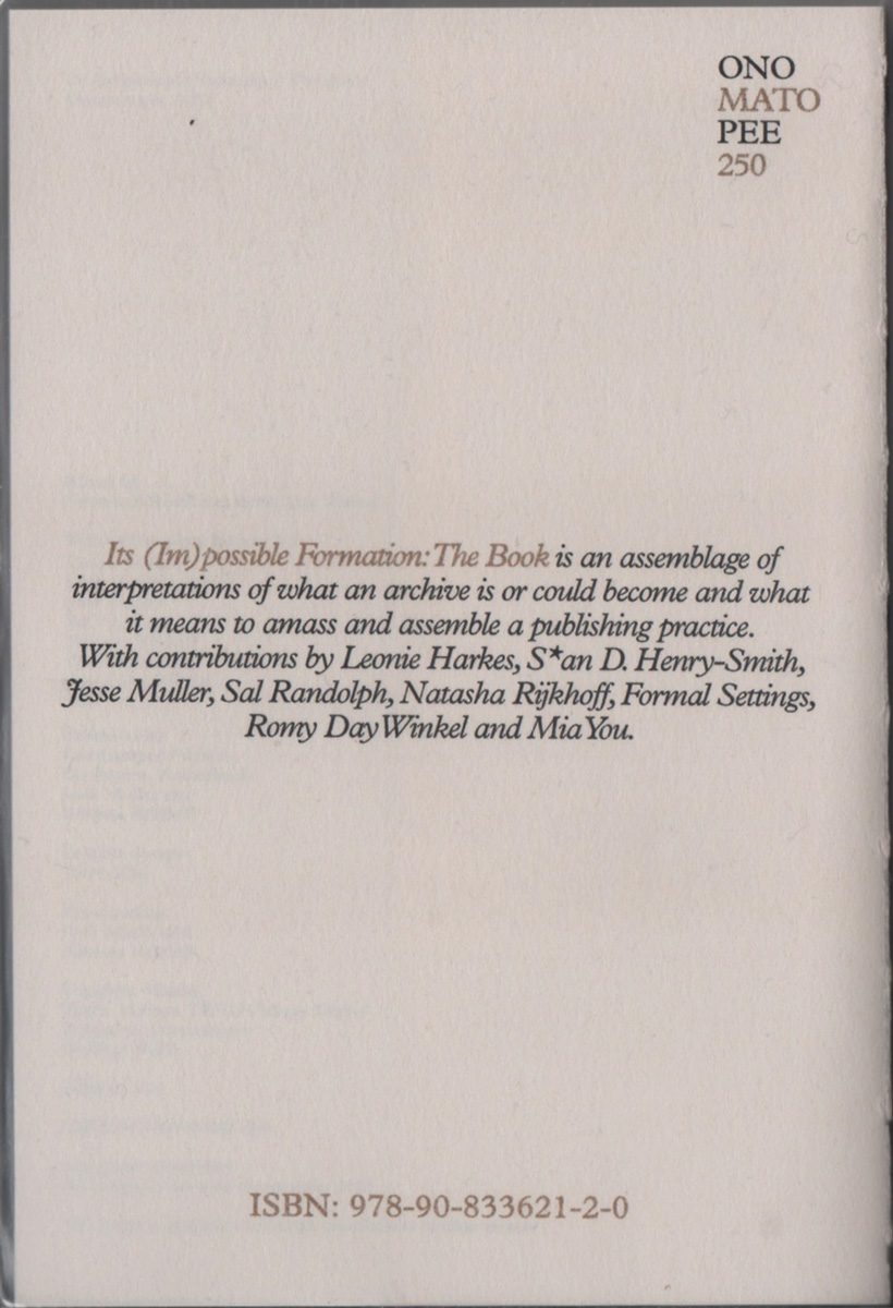 Its (Im)possible Formation: The Book is an assemblage of interpretations of what an archive is or could become and what it means to amass and assemble a publishing practice. With contributions by Leonie Harkes, S*an D. Henry-Smith, Jesse Muller, Sal Randolph, Natasha Rijkhoff, Formal Settings, Romy Day Winkel and Mia You.