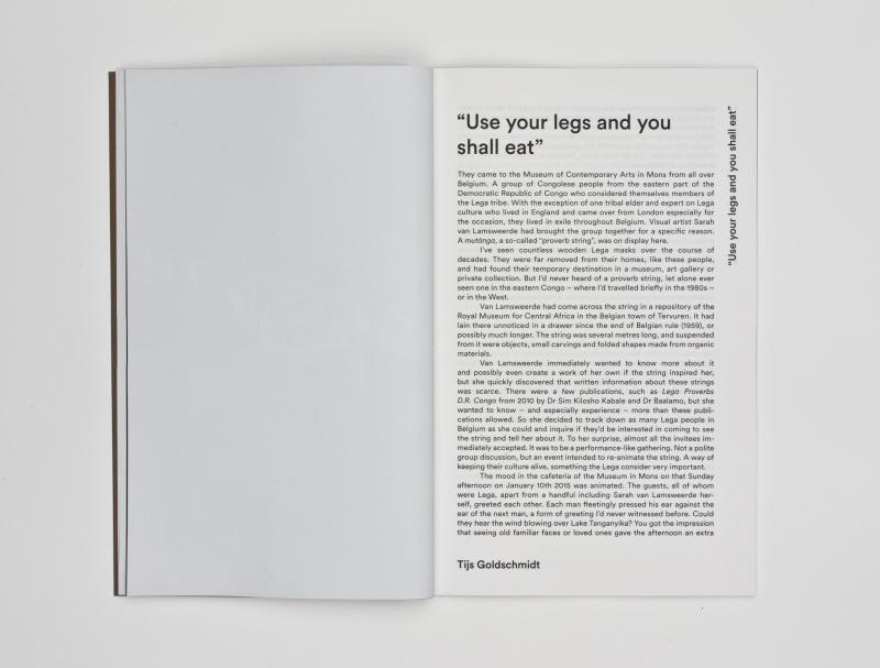 Proverb strings or mutánga play an important role in the oral tradition of the Lega, a group of people from the northeastern areas of the Democratic Republic of Congo. Each string carries 40-60 miniature objects, which represent a proverb and traditionally function as carriers of wisdom. The meaning of these objects is activated in social situations, told and re-told, often in a debate and discussion, by members of the community.