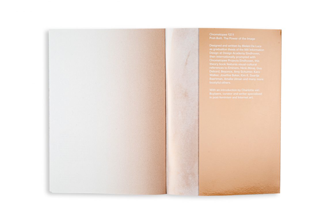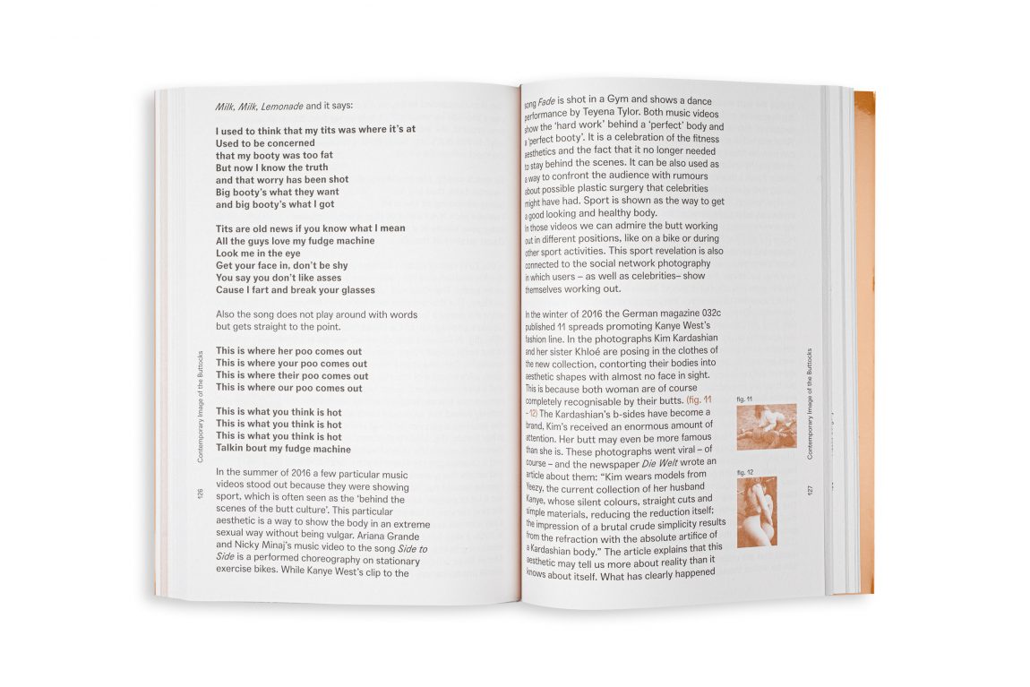 Edited in collaboration with Pernilla Ellens, designed and written by Melani de Luca as graduation thesis of the MA Information Design at Design Academy Eindhoven, then internationally prompted with Onomatopee Projects Eindhoven, this theory book features visual -cultural references to Eminem, Nicki Minaj, Guy Debord, Beyonce, Amy Schumer, Kara Walker, Josefine Baker, Kim K. Saartje Baartman, Amalia Ulman and many more bootyful others.