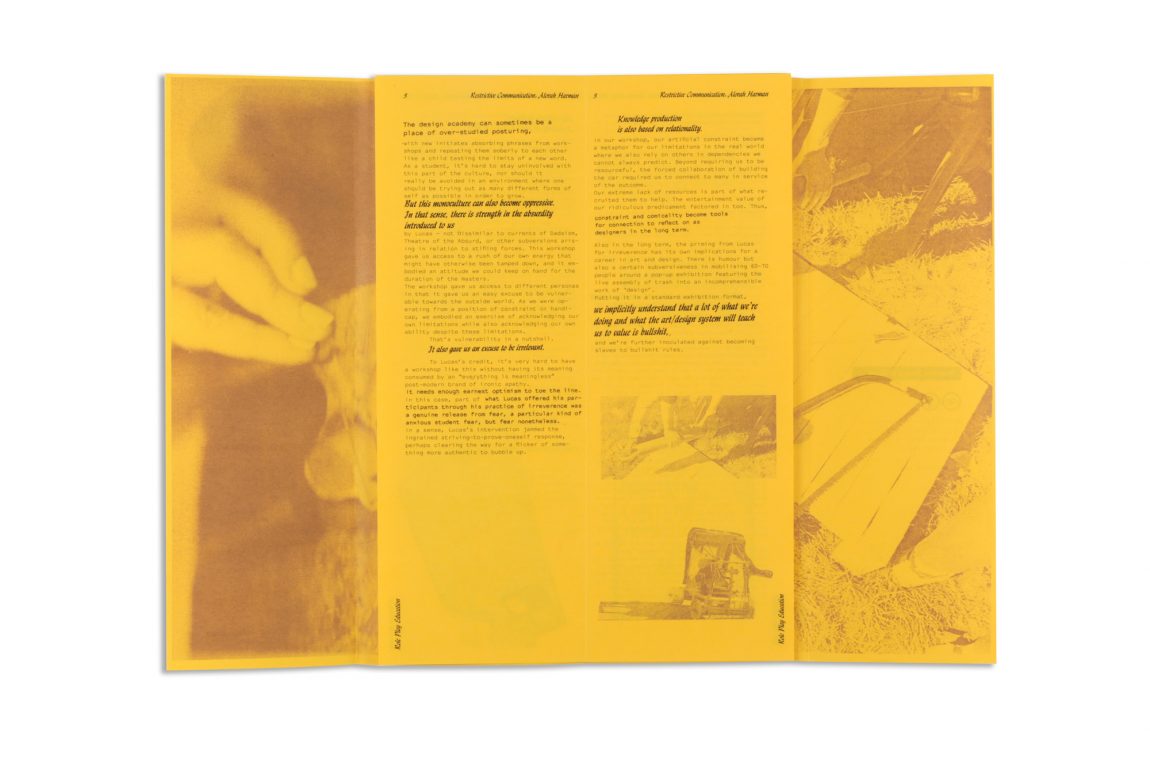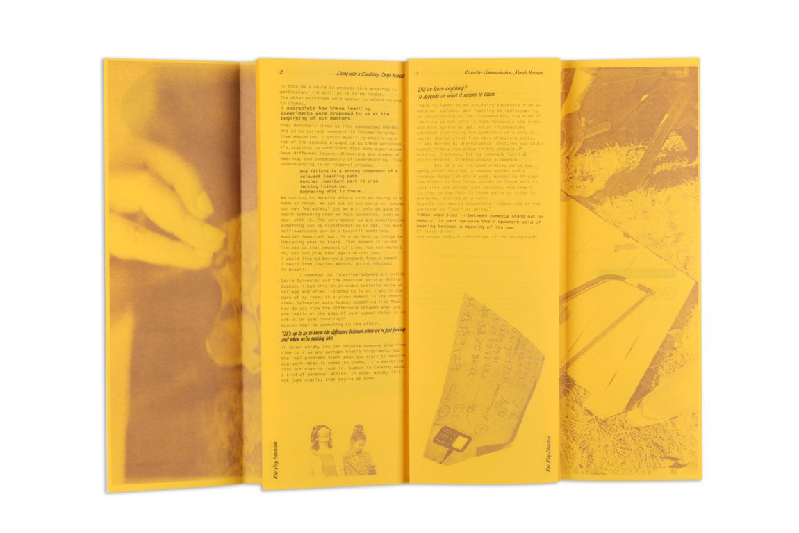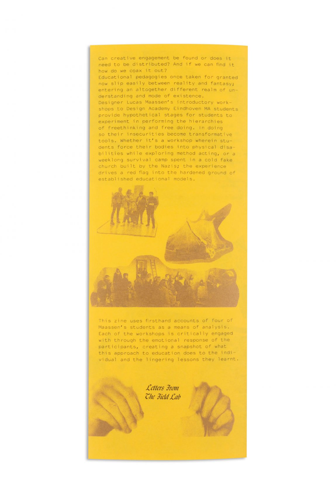 This zine uses firsthand accounts of four of Maassen’s students as a means of analysis. Each of the workshops is critically engaged with through the emotional response of the participants, creating a snapshot of what this approach to education does to the individual and the lingering lessons they learnt.