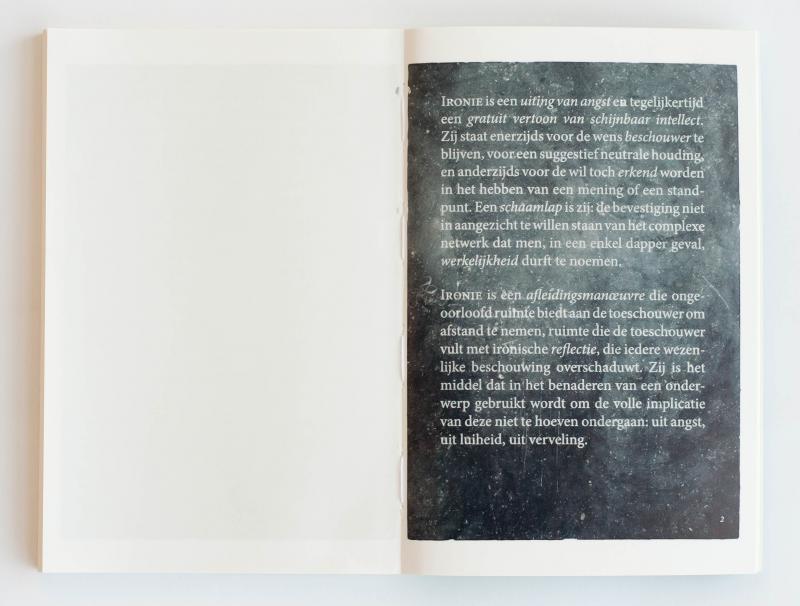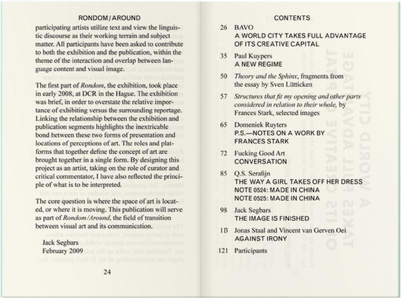 The Rondom project includes an exhibition and a publication with contributions in the light of the exchange and overlap between linguistic context and visual image. Artists who see textual discourse as their working terrain and subject matter are matched with policymakers, critics and theorists whose role is not usually visible in the actual art product. The core question is where artistic space is located and whether artistic, visual strength can withstand far-reaching social embedding and instrumentalization.