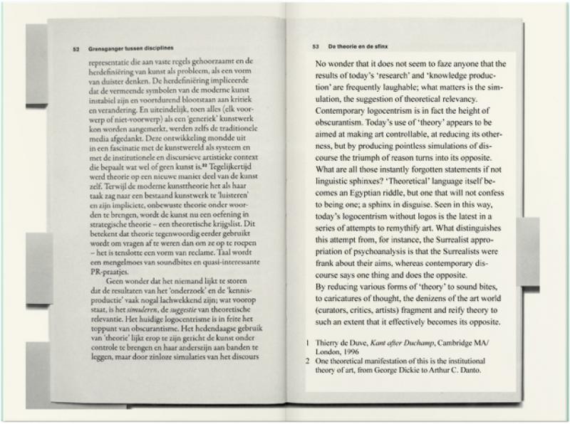 Art is increasingly embedded in a theme or a form of presentation that provides it with a clear, simple image and presents it in a social role and context. The language of this embedding and mediation has taken on a socio-political function and is a prominent factor in the choice of subject matter and the function of the art. The experience of art has come to serve as a vehicle for interpretation, as a starting point and illustration for a sociological, philosophical or social statement. Art has become a half-product in cultural production. The artists – in consultation – have assumed the position of intermediary between the demand and the supply of meaning. Art has become a veiled message, its reading an encrypted game. This development is utterly at odds with the idea of the autonomy of the arts, an idea that still persists and is upheld as the most important incentive and fundamental principle underlying the arts.