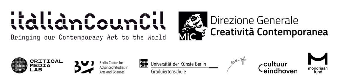 The project is supported by the Italian Council program (2024) promoted by the Directorate-General for Contemporary Creativity of the Italian Ministry of Culture, Critical Media Lab HGK Basel FHNW, University of Arts Berlin, Graduate School UdK Berlin, Kommission für künstlerische und wissenschaftliche Vorhaben (KKWV) Berlin, E.A. Shared Space Tbilisi, Cultuur Eindhoven and Mondriaan Fonds.