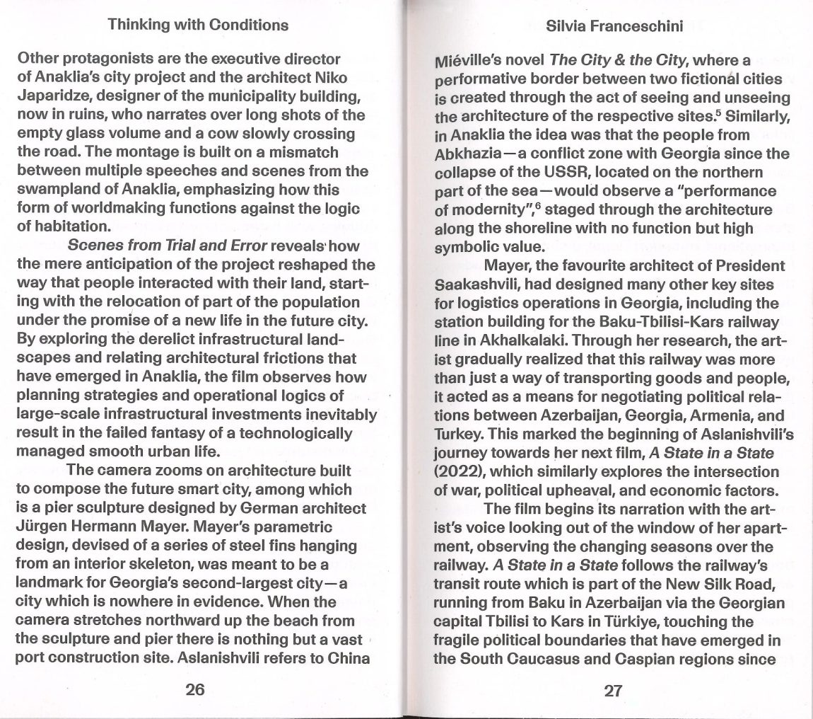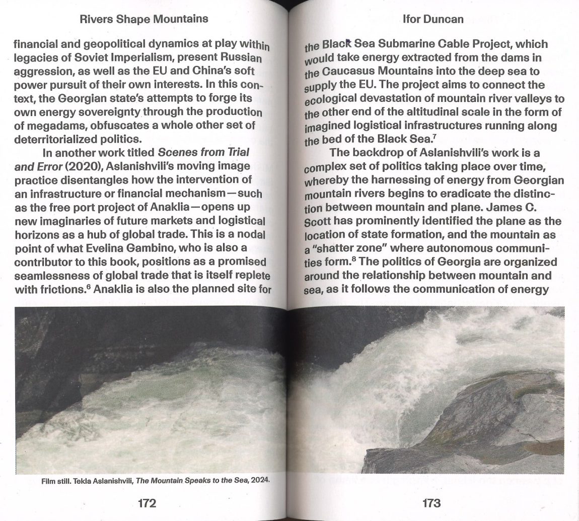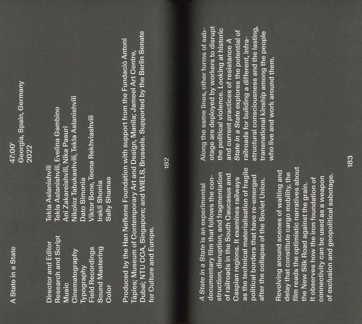 The exhibition is accompanied by a publication edited by Tekla Aslanishvili and Silvia Franceschini exploring the history and potentiality of moving images in the making and unmaking of infrastructures. Positioned between an artist’s book and a reader, the volume features contributions from writers and scholars in visual culture, political science and critical geography, such as Alexandra Aroshvili, Ifor Duncan, Evelina Gambino, and Timothy Mitchell.