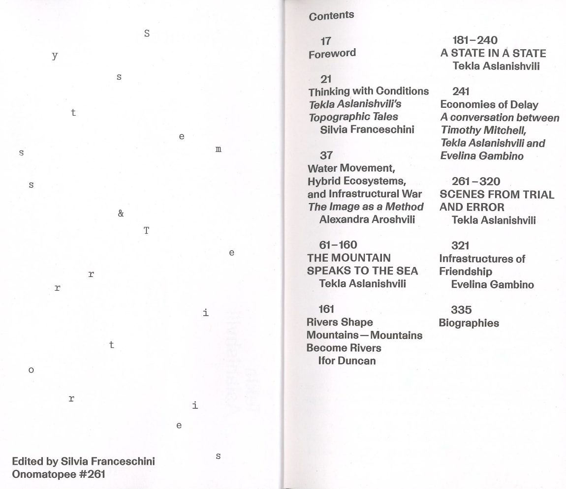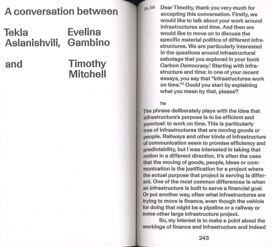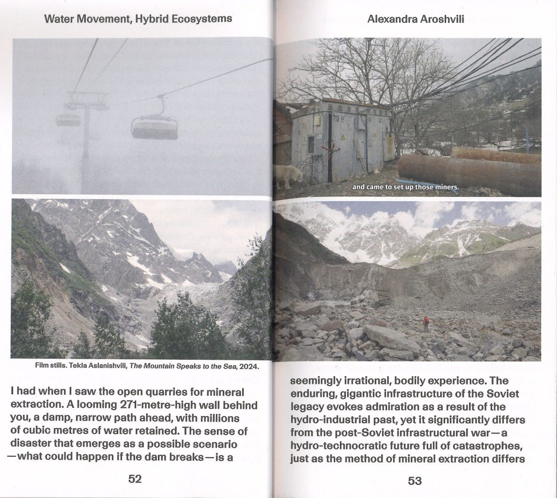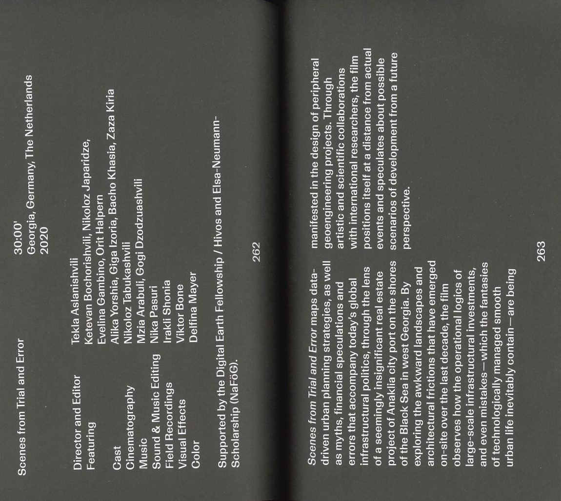 The exhibition is accompanied by a publication edited by Tekla Aslanishvili and Silvia Franceschini exploring the history and potentiality of moving images in the making and unmaking of infrastructures. Positioned between an artist’s book and a reader, the volume features contributions from writers and scholars in visual culture, political science and critical geography, such as Alexandra Aroshvili, Ifor Duncan, Evelina Gambino, and Timothy Mitchell.