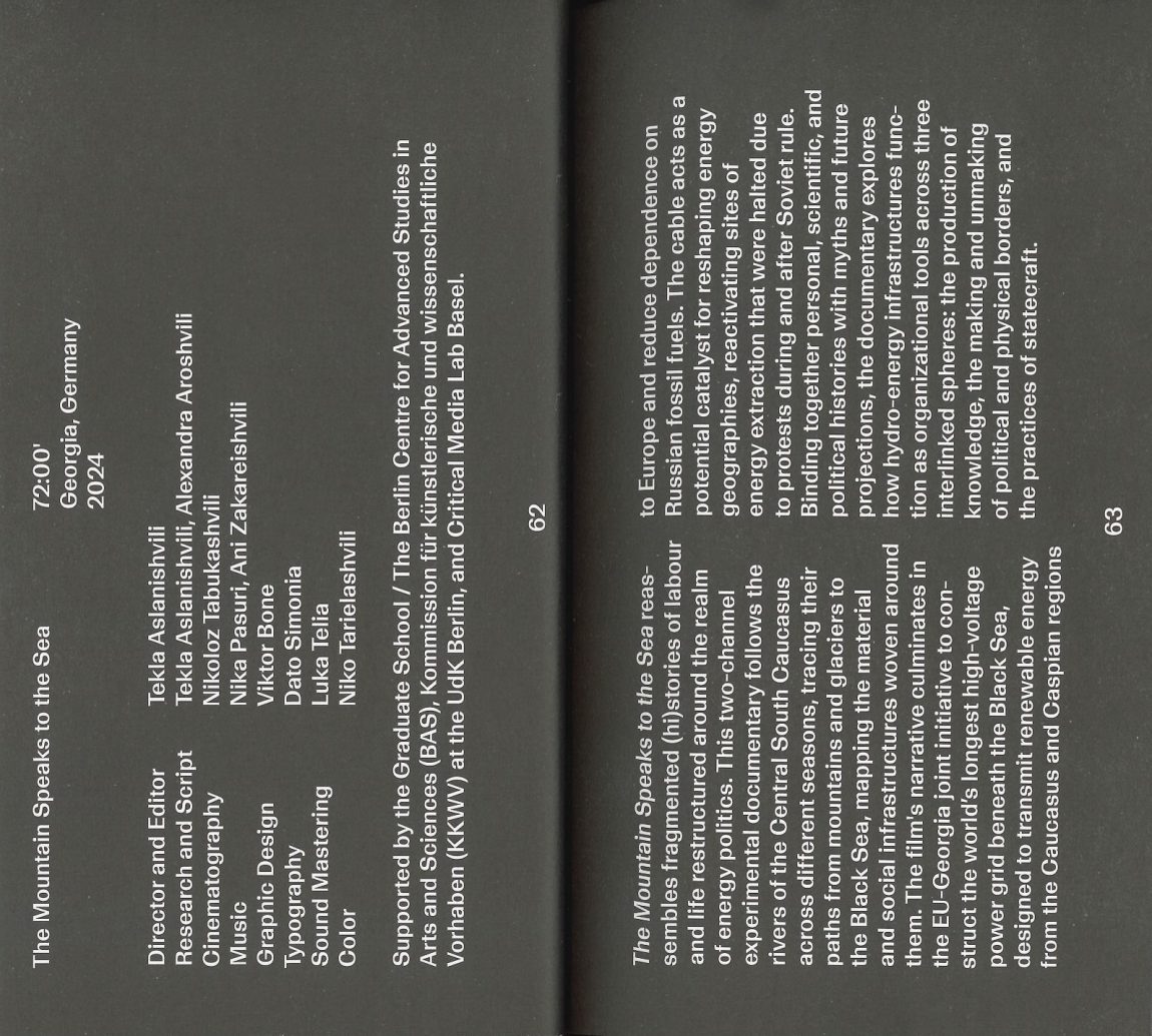 Through a dynamic moving-image landscape designed by architect Natalia Nebieridze, the exhibition presents Aslanishvili’s new cinematic project The Mountain Speaks to the Sea (2024), that reassembles fragmented (hi)stories of restructuring labor and life around the realm of global energy politics. The experimental two-channel documentary follows the rivers of the South Caucasus, tracing their paths from the mountains to the Black Sea, mapping the material and social infrastructures surrounding them through the shifting seasons. The focus culminates in the joint EU-Georgia initiative to construct the world’s longest high-voltage power grid under the Black Sea, aimed at reducing the EU’s dependency on Russia for global data and energy transmission. By intertwining personal and distant histories with myths and future orientations, the film examines how energy infrastructures are reforming not only the social and geological landscapes but also the making and unmaking of state borders and the practices of statecraft.