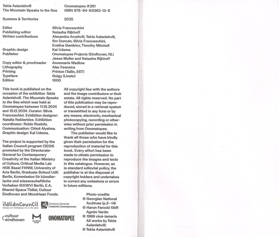 “Tekla Aslanishvili. The Mountain Speaks to the Sea” is the first exhibition in the five-year program Systems and Territories, guest-curated by Silvia Franceschini. The program focuses on monographic and thematic exhibitions, which stem from long-term investigations and collaborations between artists, researchers, and communities. By exploring the shifting relations between governments, people, and their territories through the lens of large-scale infrastructure projects, Aslanishvili's exhibition tackles the intersecting issues of geopolitical tensions, energy politics, and economic globalization that affect the South of Caucasus.