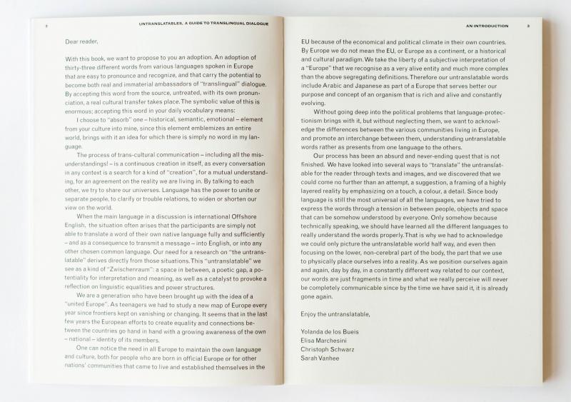 Yolanda de los Bueis, Christoph Schwarz, Elisa Marchesini and Sarah Vanhee brought about the reach of these untranslatables in order to fill in the possible gaps and understandings. Accompanying these words and there textual explanations, photos are presented to serve as extension or further experience of the scope of these words. These photographs are not depictive; they rather focus on body language with the potential to inscribe different meanings, lost in translation. The message of it might be clear, but there is always a possibility not to be understood.