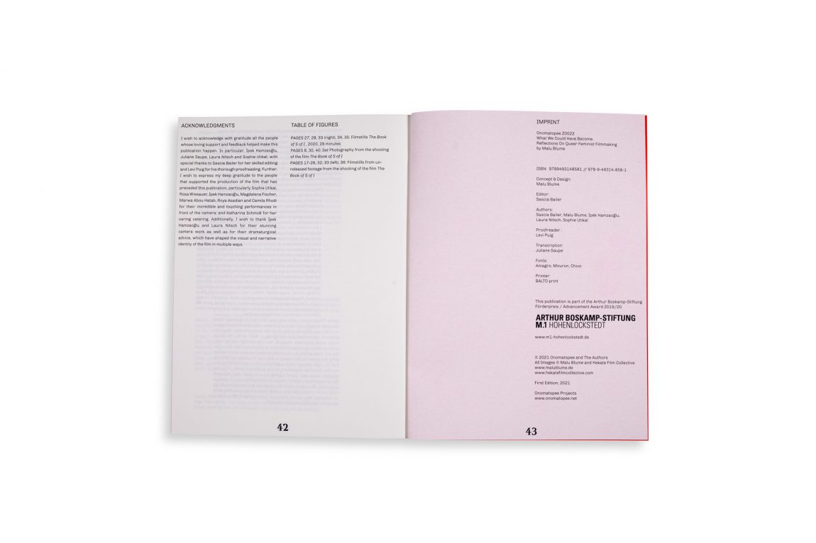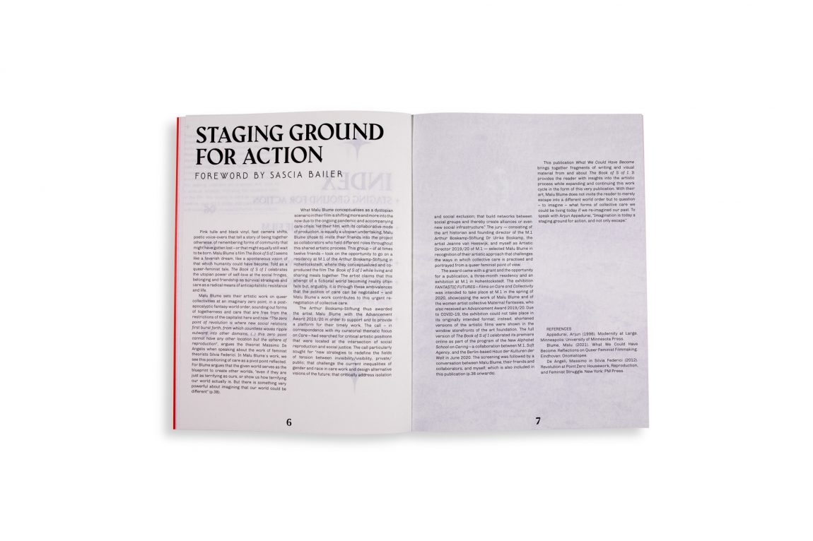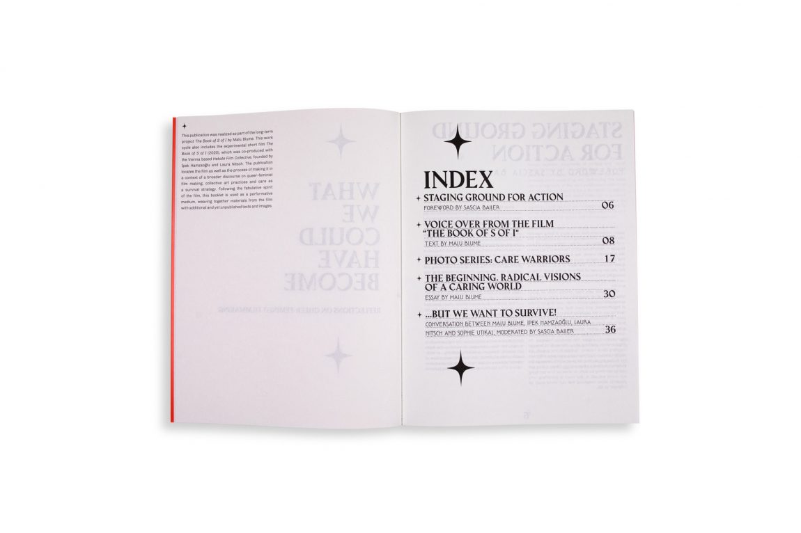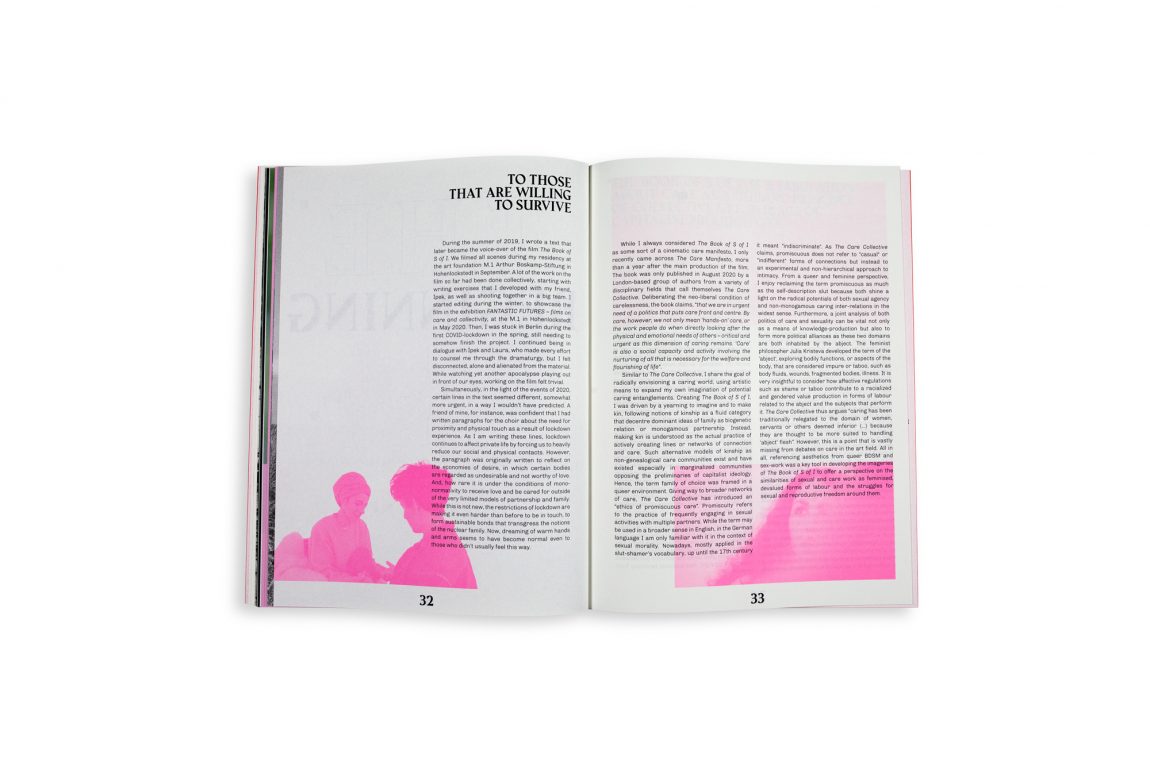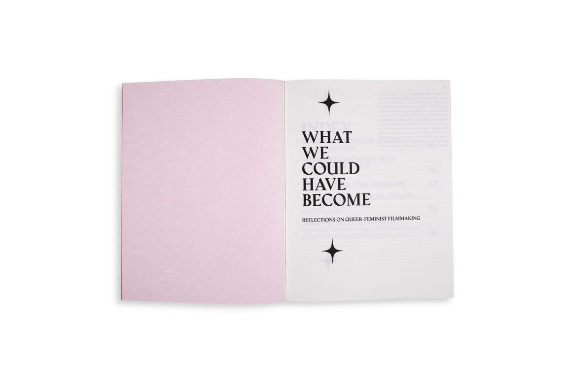 The publication What we could have become explores the radical potentials of care and speculative fiction in the context of queer feminist collective filmmaking. Departing from the experimental short film The Book of S of I (2020) by Malu Blume, this publication is a documentation of the film project just as much as its own artistic medium. Using a performative mode, it weaves together film stills with unreleased set photography, creating a visual narration that reflects caring and kinship through a queer feminist – and femme – lens.