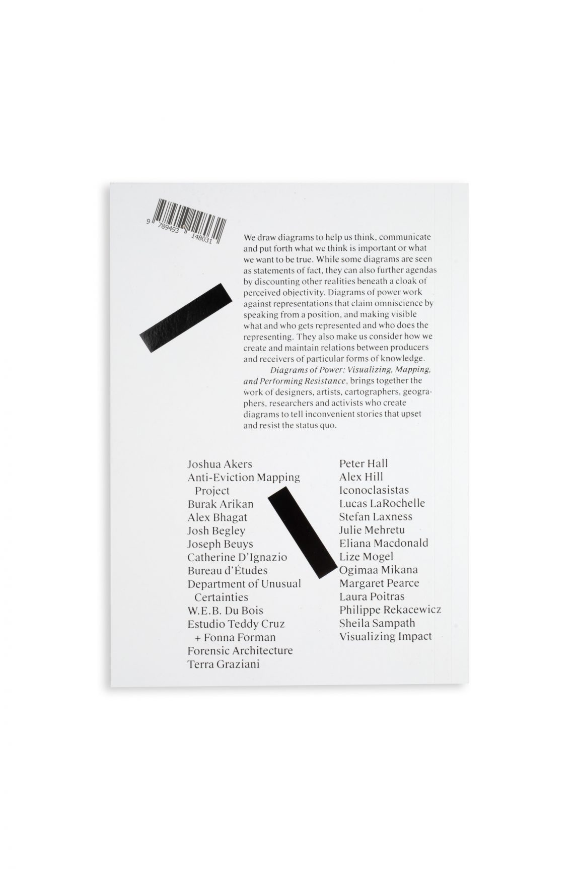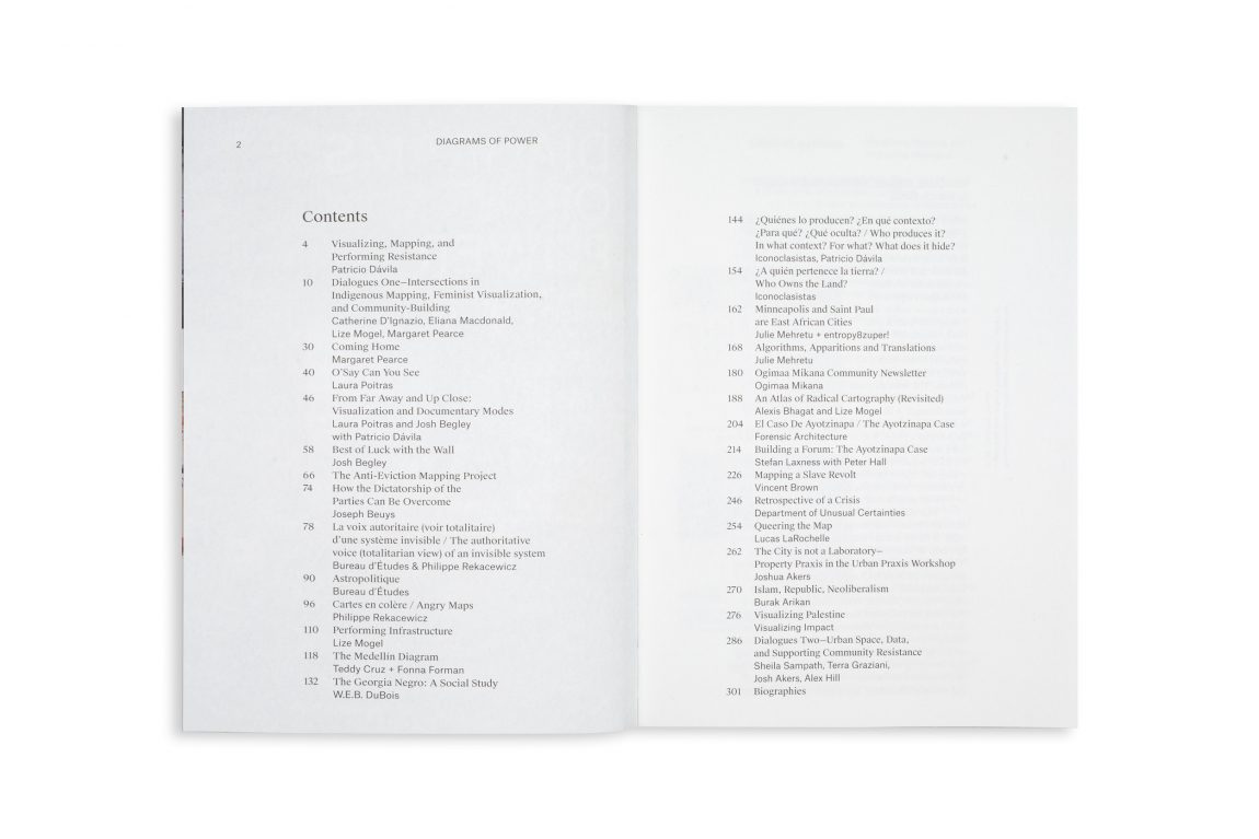 Edited by Patricio Dávila. Words and works by Joshua Akers, Burak Arikan, Josh Begley, Joseph Beuys, Alexis Bhagat, Vincent Brown, Bureau d’Études, Teddy Cruz, Department of Unusual Certainties, Peter Hall, Alex Hill, W.E.B. DuBois, Patricio Dávila, Catherine D’Ignazio, Forensic Architecture, Fonna Forman, Terra Graziani, Iconoclasistas, Lucas LaRochelle, Eliana MacDonald, Julie Mehretu, Lize Mogel, Ogimaa Mikana, Margaret Pearce, Laura Poitras, Philippe Rekacewicz, Sheila Sampath, and Visualizing Impact.
