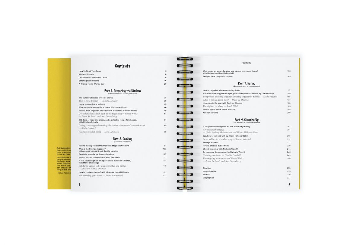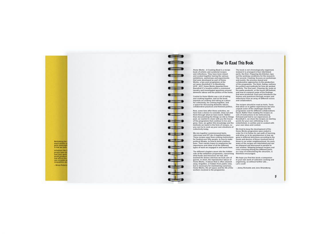 Home Works – A Cooking Book: Recipes for Organising with Art and Domestic Work, expands on cooking with art and food as a process for coming together and building collectivity. The book highlights the art and politics of eating together through a number of artistic, curatorial and tasty dinner recipes. Recipes that nourish and nurture conversations around domestic labour, collaborative practices and feminist politics, expanded upon through a series of essays and interviews.