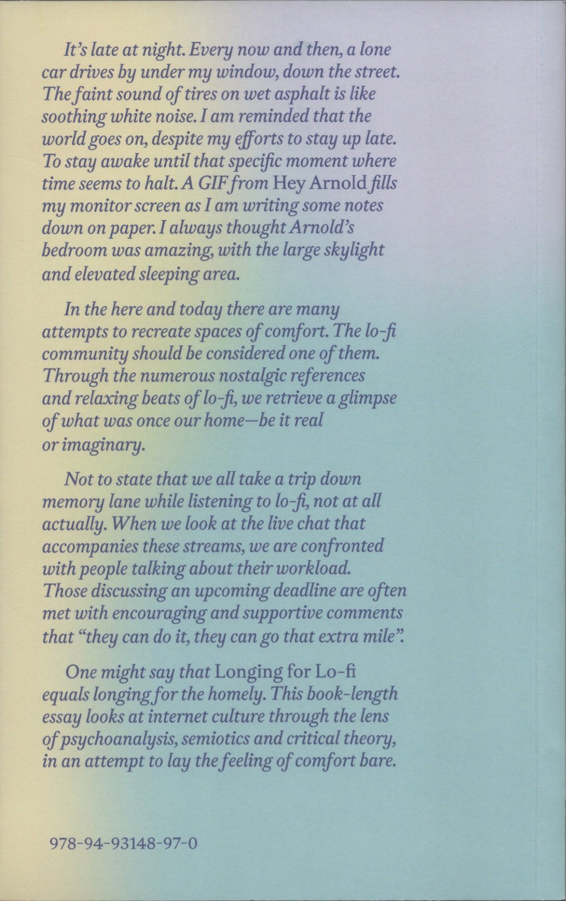 One might say that Longing for Lo-fi equals longing for the homely. This book-length essay looks at internet culture through the lens of psychoanalysis, semiotics and critical theory, in an attempt to lay the feeling of comfort bare.