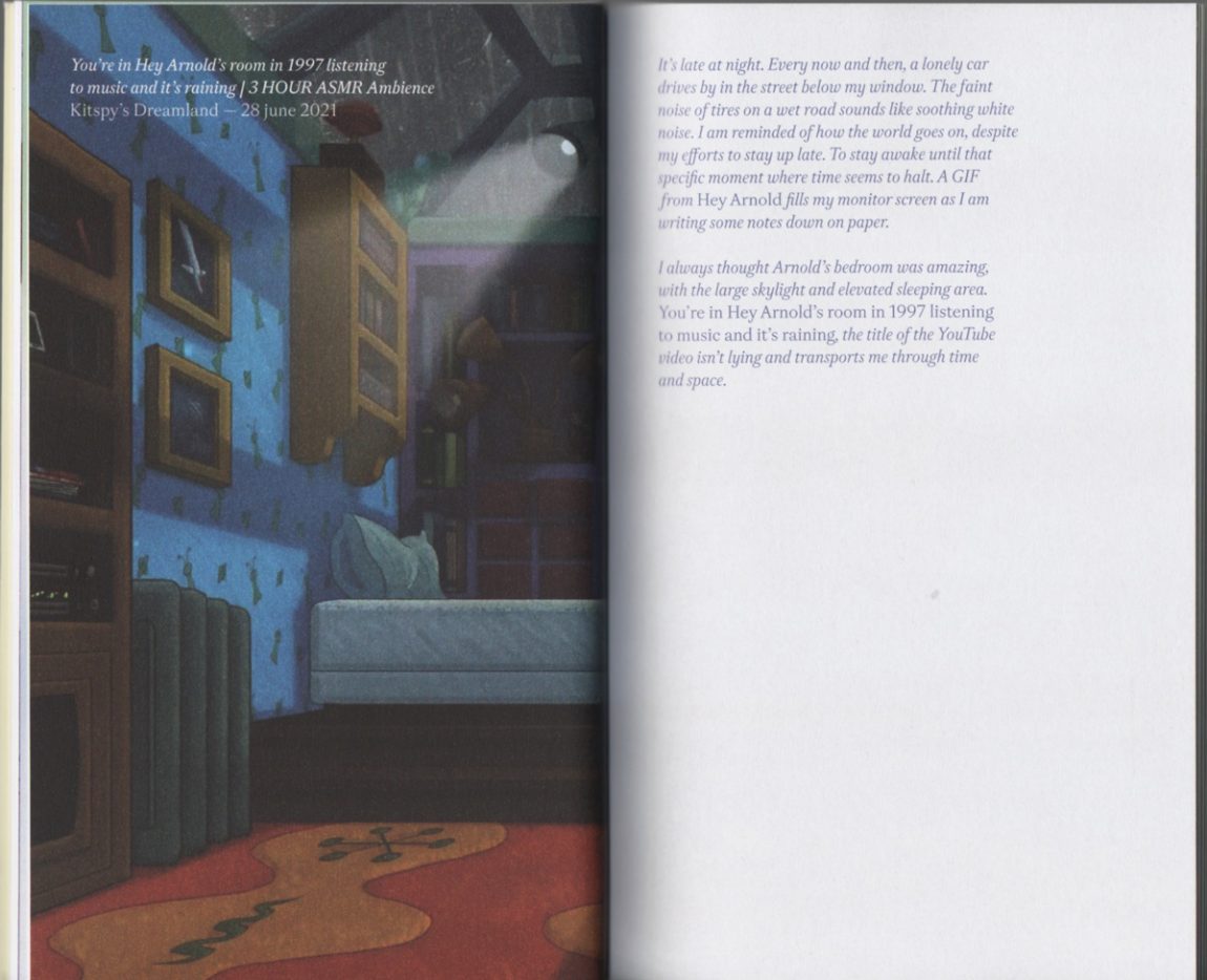 It’s late at night. Every now and then, a lone car drives by under my window, down the street. The faint sound of tires on wet asphalt is like soothing white noise. I am reminded that the world goes on, despite my efforts to stay up late. To stay awake until that specific moment where time seems to halt. A GIF from Hey Arnold fills my monitor screen as I am writing some notes down on paper. I always thought Arnold’s bedroom was amazing, with the large skylight and elevated sleeping area.
