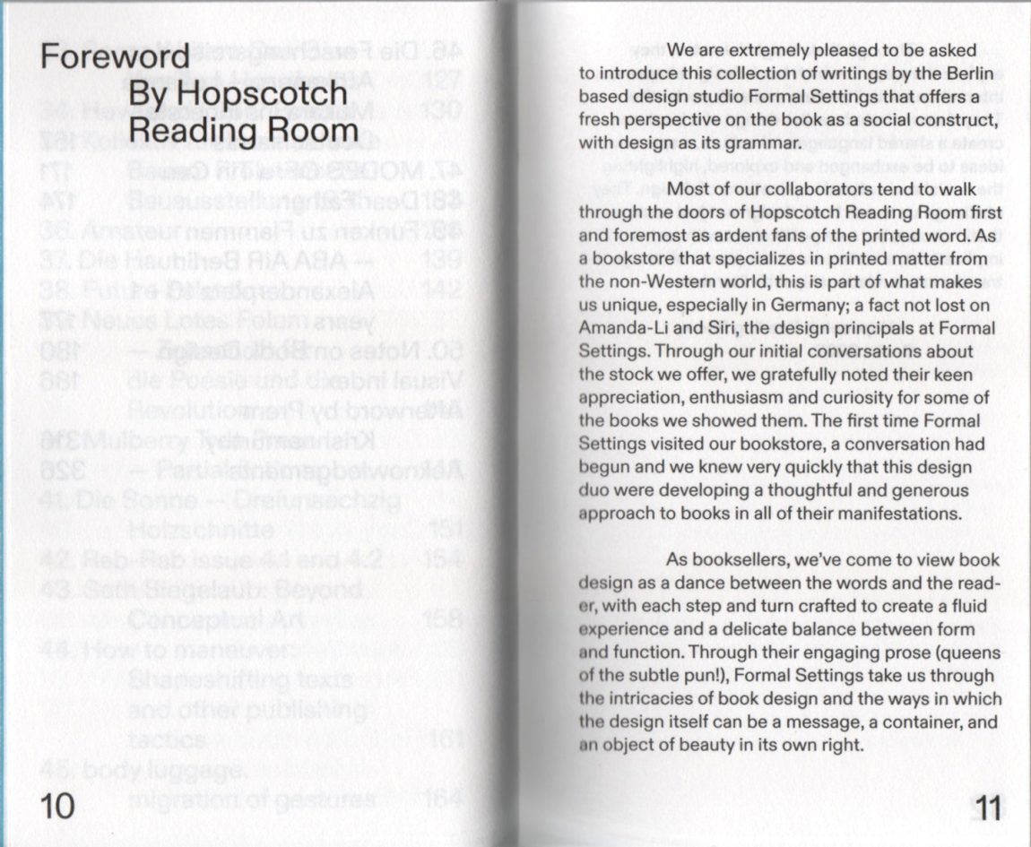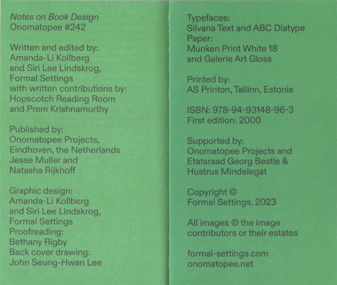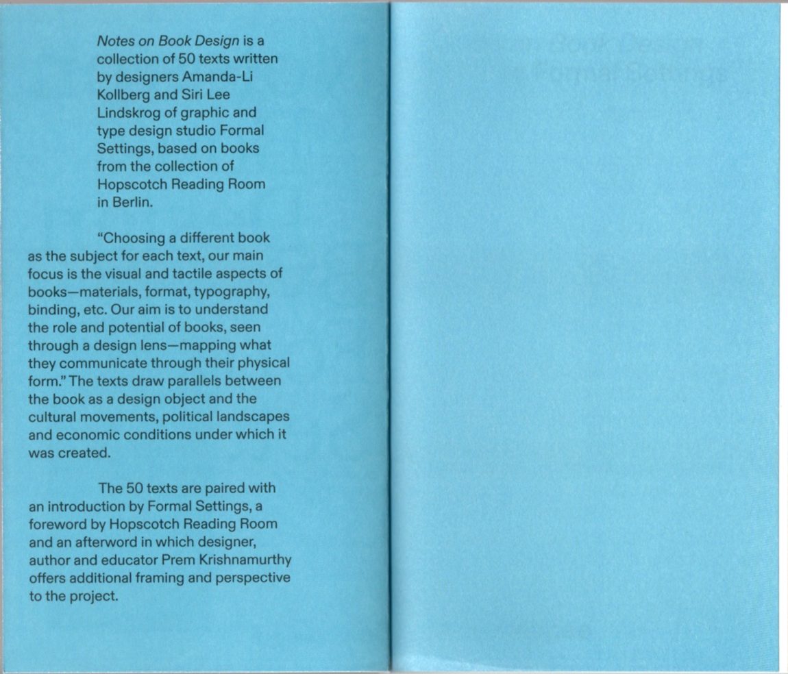 Notes on Book Design is a collection of 50 texts written by designers Siri Lee Lindskrog and Amanda-Li Kollberg of graphic and type design studio Formal Settings, based on books from the collection of Hopscotch Reading Room in Berlin.