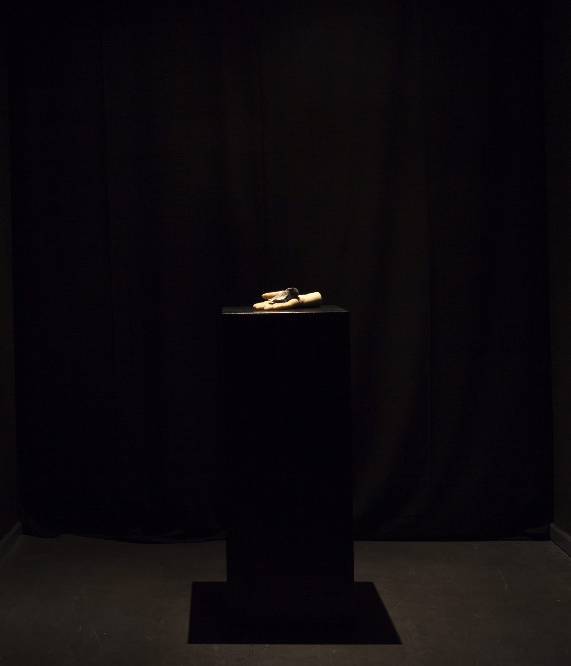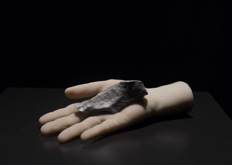 The object on display That What Makes Us Human is a 1:1 titanium 3D printed reproduction of a Canyon Diablo Meteorite, which fell on Earth 50.000 years ago. The meteorite fits perfectly in a human hand and resembles flint tools that prehistorical Paleolithic humans used around the time of the meteor’s impact. The object, which might been used as a weapon or a tool, signalizes the beginning of an era when human consciousness was evolving, eventually leading up to the development of technological devices that make a similar impact on earth as a meteorite. The titanium copy of the meteorite here rests on a silicone replica of a human hand – in times when humanity is able to create H-bombs, which may release larger forces than an impact of a meteorite. The sculpture is a speculative artefact dedicated to this evolution of technologies, and our quest for cosmic powers.