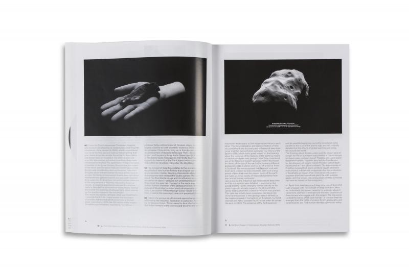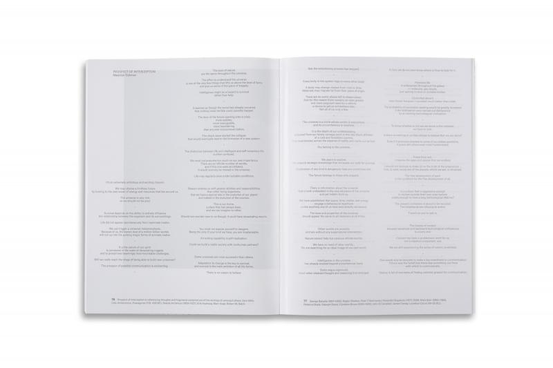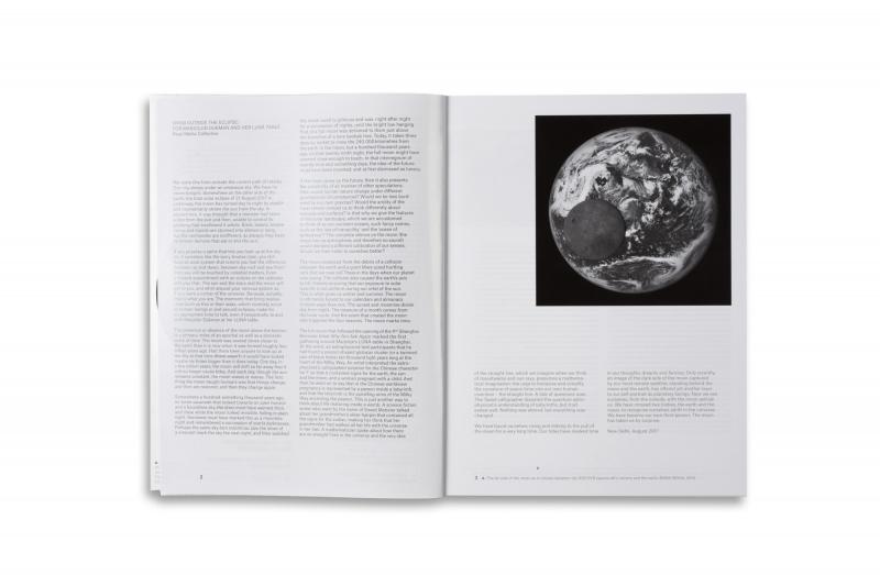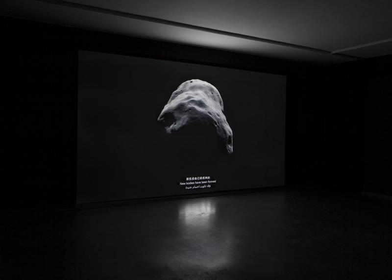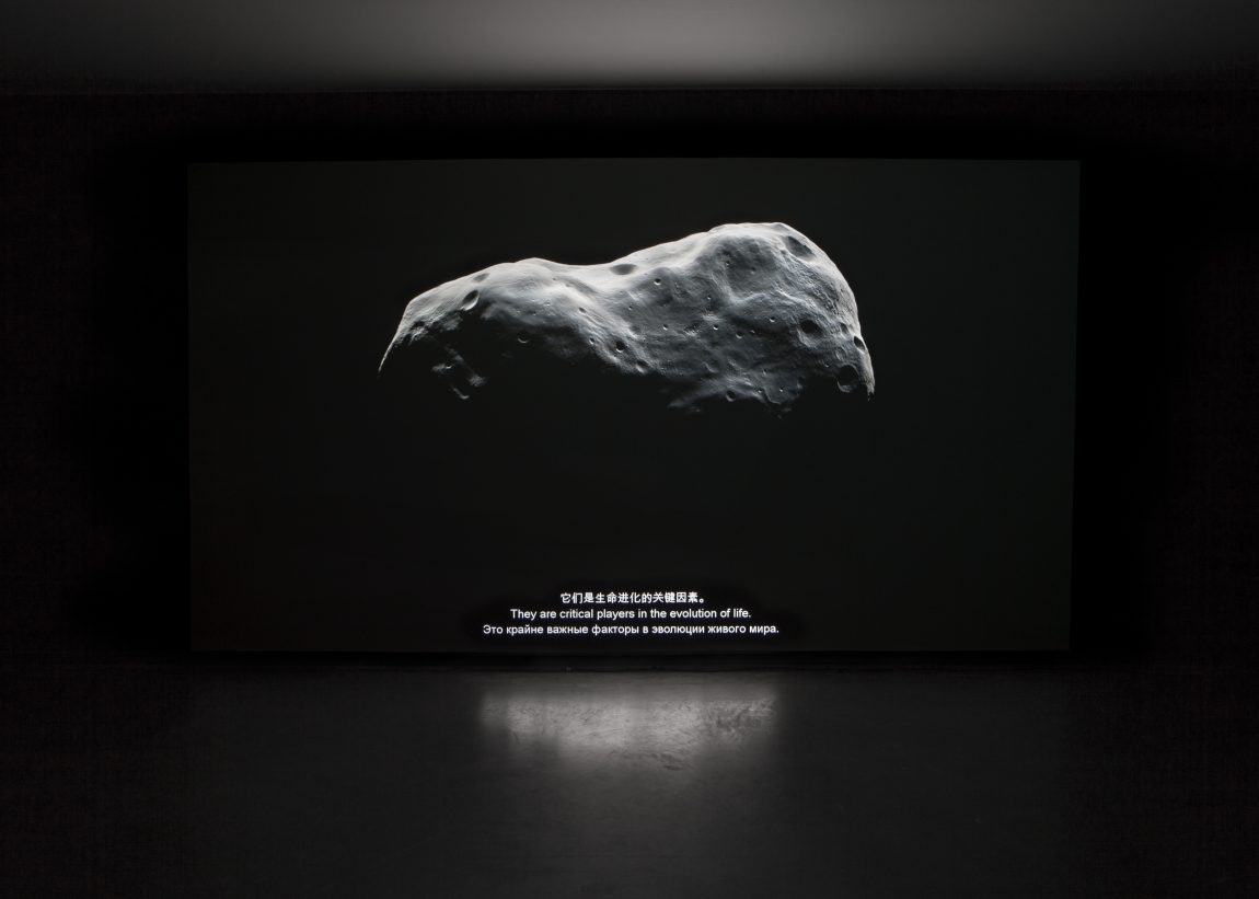 The accompanying multilingual narrative is a collection of quotations from various found sources, including science (astrophysics, cosmology, cognition) to spiritual approaches and historical resources, expressing curiosity and desire of space exploration, going back as far as 1500BC until today. The text is translated into Chinese and English accompanied with five other changing languages (Hindi, Arabic, Russian, Japanese and Spanish), all largely spoken official world languages and relating to countries involved in important space programs, astronomical projects, search for extraterrestrial intelligence and future asteroid mining. These texts often speak in ’the name of humanity’ in a quite conflicted way. The multiple languages enhance the suggestion of a universal voice and in the same time add another layer of complexity in the interpretation.