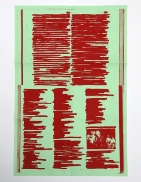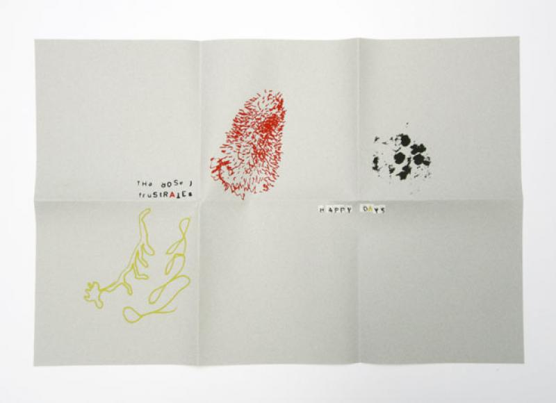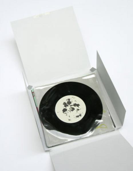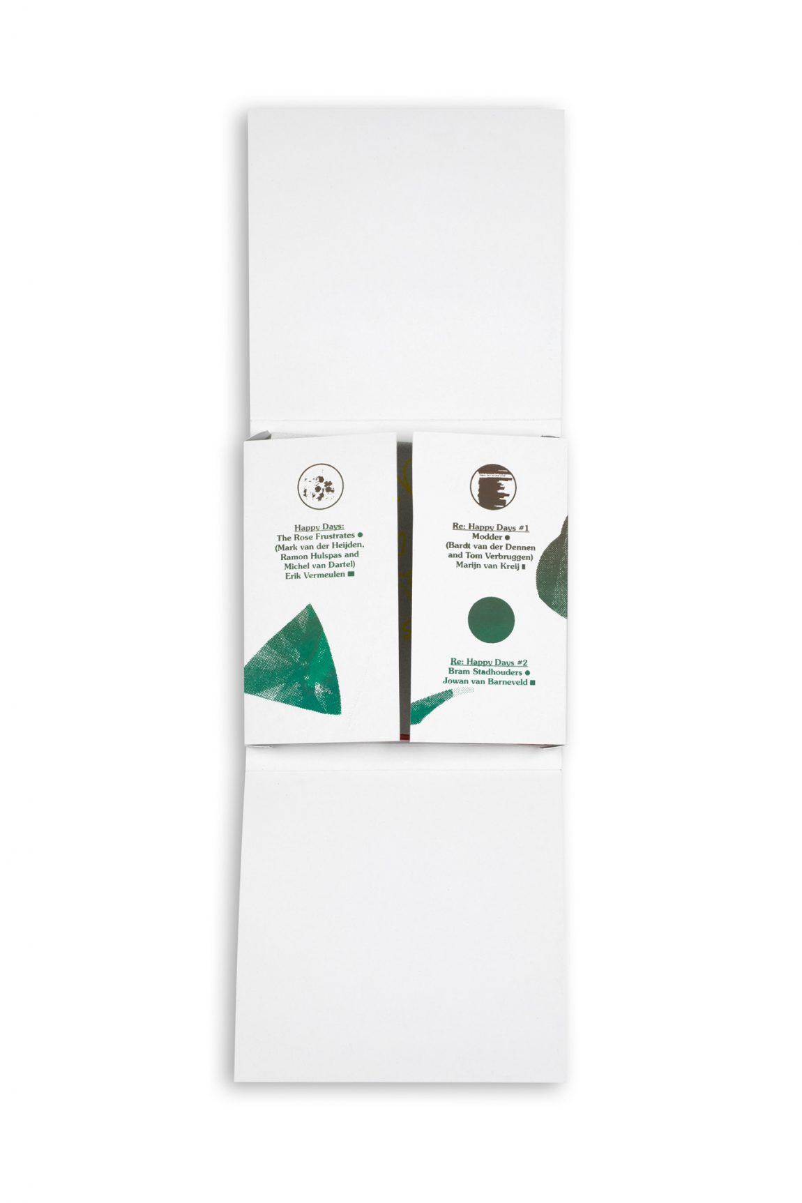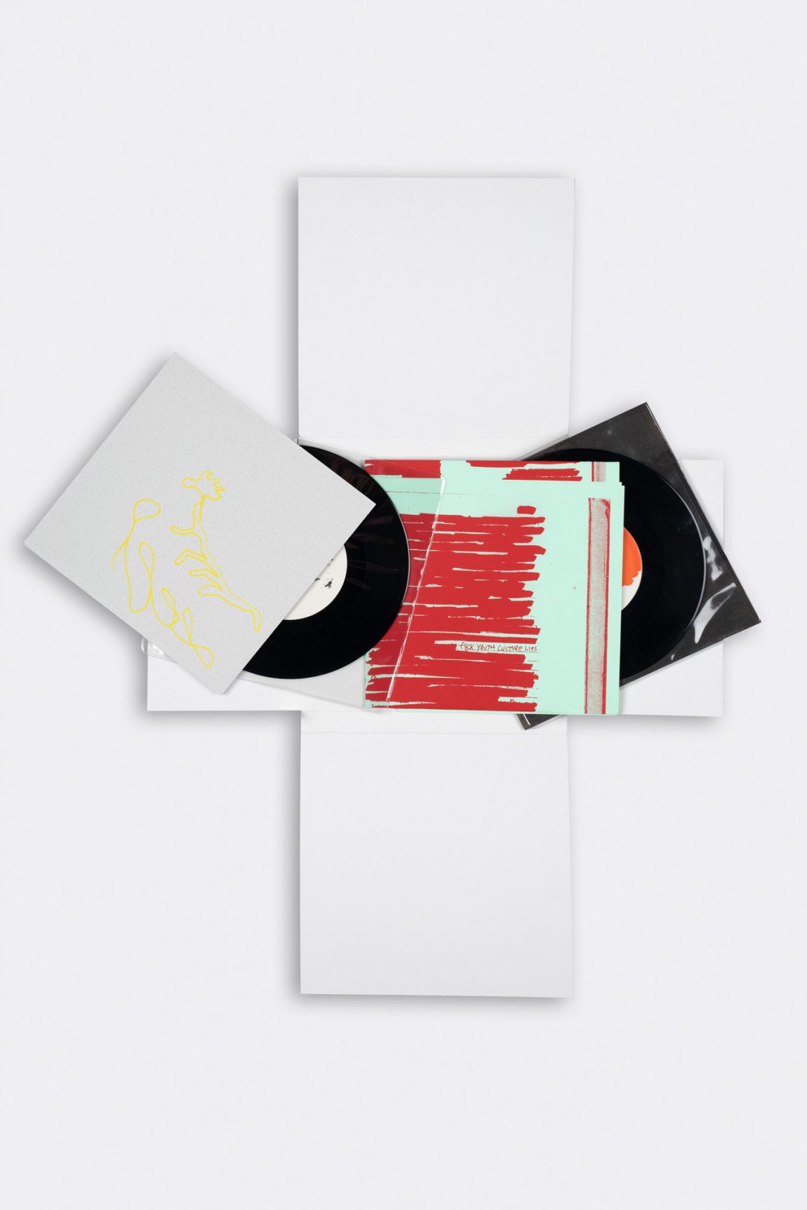 Two 7 inch vinyl recors, a silcscreened and ink manipulated work on cardboard by Joan van Barneveld and a silksreened poster by both Marijn van Kreij as Erik vermeulen in a silcscreened cover designed by Remco van Bladel