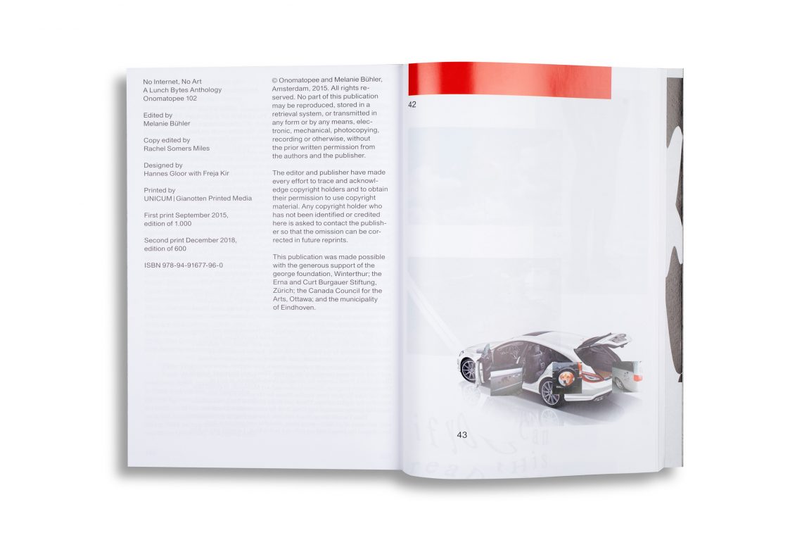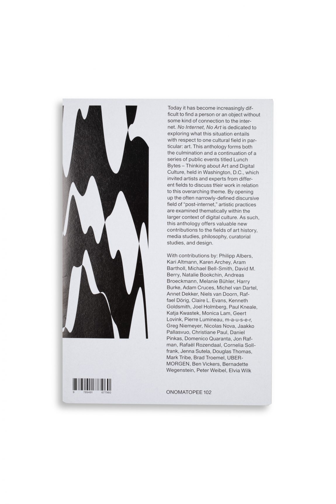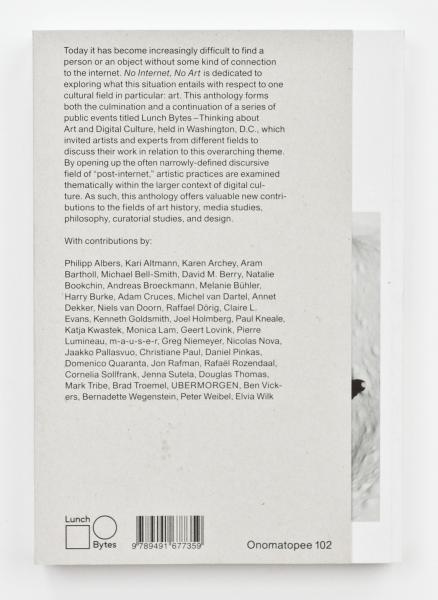 Today it has become increasingly difficult to find a person or an object without some kind of connection to the internet. No Internet, No Art is dedicated to exploring what this situation entails with respect to one cultural field in particular: art. This anthology forms both the culmination and a continuation of a series of public events titled Lunch Bytes – Thinking about Art and Digital Culture, held in Washington, D.C., which invited artists and experts from different fields to discuss their work in relation to this overarching theme.